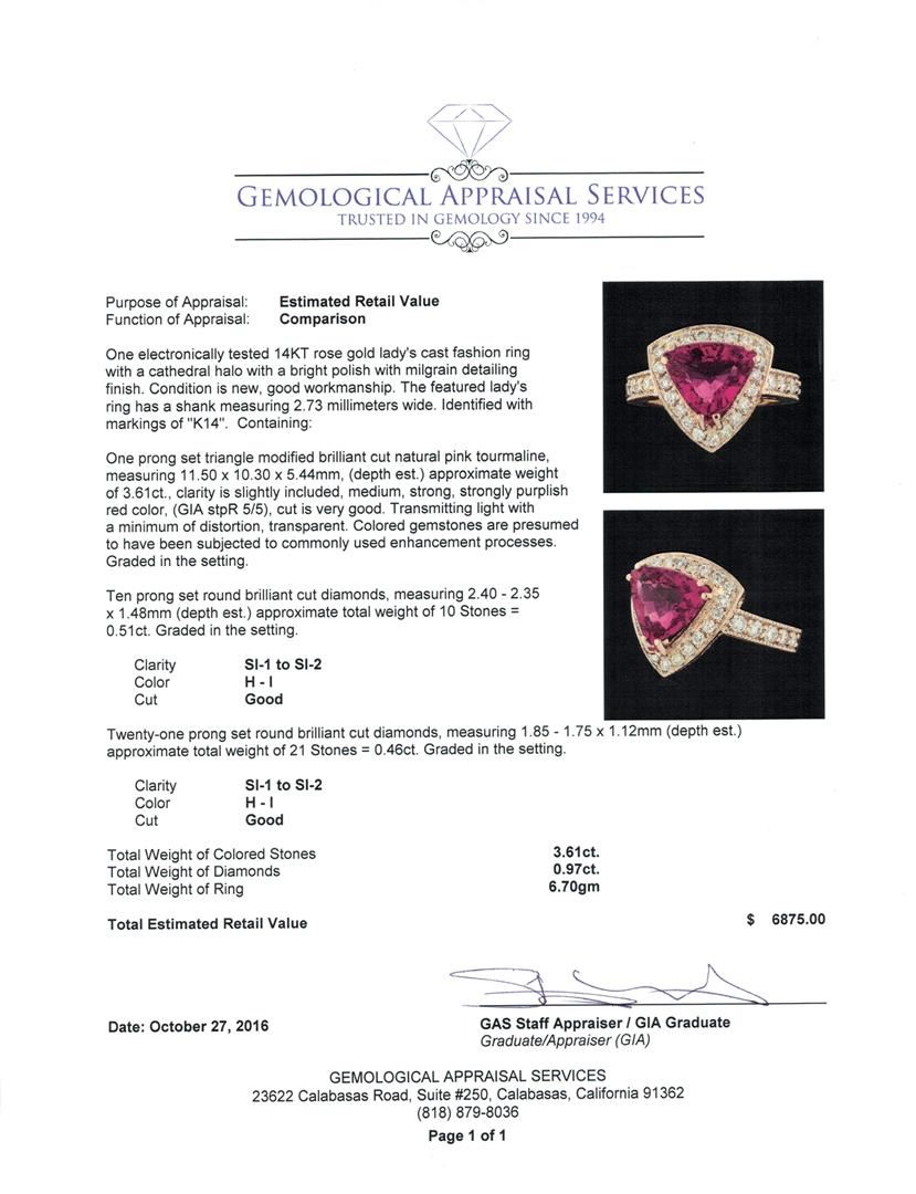 One electronically tested 14KT rose gold lady's cast fashion ring with a cathedral halo with a bright polish with milgrain detailing finish. The featured lady's ring has a shank measuring 2.73 millimeters wide. Identified with markings of 'K14'. Condition is new, good workmanship. Containing: One prong set triangle modified brilliant cut natural pink tourmaline, measuring 11.50 x 10.30 x 5.44mm, (depth est.) approximate weight of 3.61ct., clarity is slightly included, medium, strong, strongly purplish red color, (GIA stpR 5/5), cut is very good. Transmitting light with a minimum of distortion, transparent. Colored gemstones are presumed to have been subjected to commonly used enhancement processes. Graded in the setting. Ten prong set round brilliant cut diamonds, measuring 2.40 - 2.35 x 1.48mm (depth est.) approximate total weight of 10 Stones = 0.51ct. Graded in the setting. Clarity SI-1 to SI-2. Color: H - I Cut Good Twenty-One prong set round brilliant cut diamonds, measuring 1.85 - 1.75 x 1.12mm (depth est.) approximate total weight of 21 Stones = 0.46ct. Graded in the setting. Clarity SI-1 to SI-2. Color: H - I Cut Good. Total Weight of Colored Stones 3.61ct.. Total Weight of Diamonds 0.97ct.. Total Weight of Ring 6.70gm. GAS Appraised at $6,875.00.