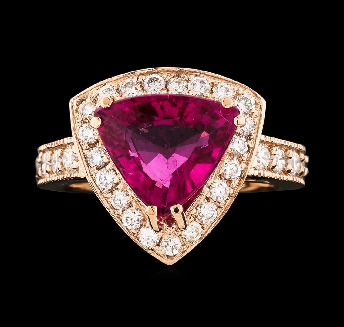 One electronically tested 14KT rose gold lady's cast fashion ring with a cathedral halo with a bright polish with milgrain detailing finish. The featured lady's ring has a shank measuring 2.73 millimeters wide. Identified with markings of 'K14'. Condition is new, good workmanship. Containing: One prong set triangle modified brilliant cut natural pink tourmaline, measuring 11.50 x 10.30 x 5.44mm, (depth est.) approximate weight of 3.61ct., clarity is slightly included, medium, strong, strongly purplish red color, (GIA stpR 5/5), cut is very good. Transmitting light with a minimum of distortion, transparent. Colored gemstones are presumed to have been subjected to commonly used enhancement processes. Graded in the setting. Ten prong set round brilliant cut diamonds, measuring 2.40 - 2.35 x 1.48mm (depth est.) approximate total weight of 10 Stones = 0.51ct. Graded in the setting. Clarity SI-1 to SI-2. Color: H - I Cut Good Twenty-One prong set round brilliant cut diamonds, measuring 1.85 - 1.75 x 1.12mm (depth est.) approximate total weight of 21 Stones = 0.46ct. Graded in the setting. Clarity SI-1 to SI-2. Color: H - I Cut Good. Total Weight of Colored Stones 3.61ct.. Total Weight of Diamonds 0.97ct.. Total Weight of Ring 6.70gm. GAS Appraised at $6,875.00.