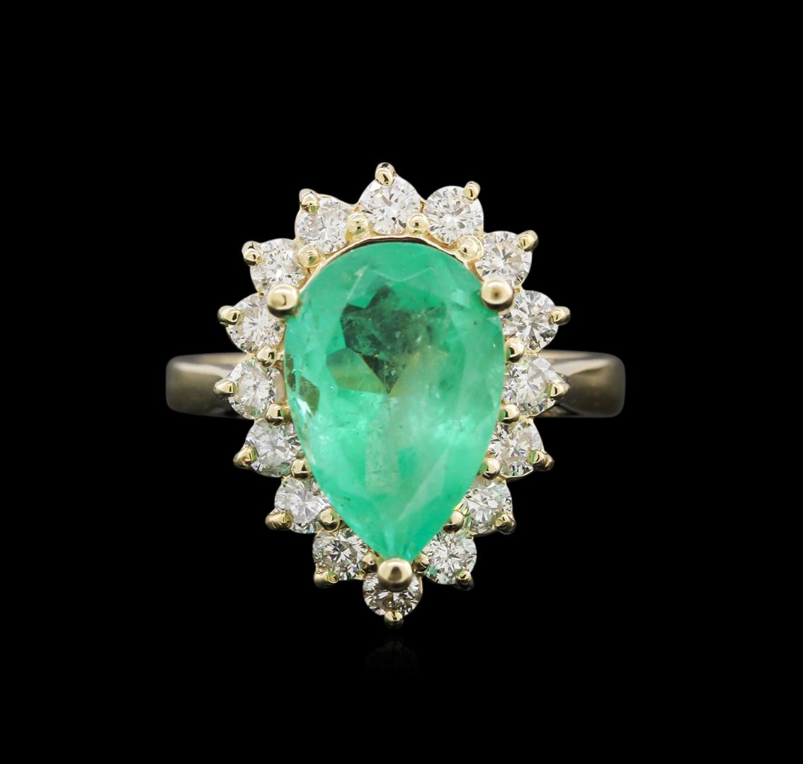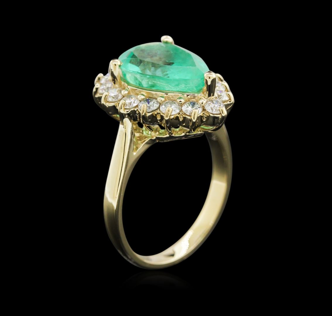 One electronically tested 14KT yellow gold lady's cast fashion ring with a basket halo with a bright polish finish. The featured lady's ring has a shank measuring 2.42 millimeters wide. Identified with markings of "K14". Condition is new, good workmanship. Containing: One prong set pear modified brilliant cut natural emerald, measuring 13.10 x 8.82 x 5.98mm, approximate weight of 3.61ct., clarity is moderately included, type III, medium light, moderately strong, very slightly bluish green color, (GIA vslbG 4/4), cut is good. Transmitting light somewhat diffusely, transparent to translucent. Naturally occurring internal & external characteristics are present. Indications of oil residue. Graded in the setting. Sixteen prong set round brilliant cut diamonds, measuring 2.50 - 2.40 x 1.49mm (depth est.) approximate total weight of 16 Stones = 0.88ct. Graded in the setting. Clarity: SI-2 to I-1. Color: H - I. Cut Good. Total Weight of Colored Stones 3.61ct. Total Weight of Diamonds 0.88ct. Total Weight of Ring 6.10gm. GAS Appraised at $6,225.00.