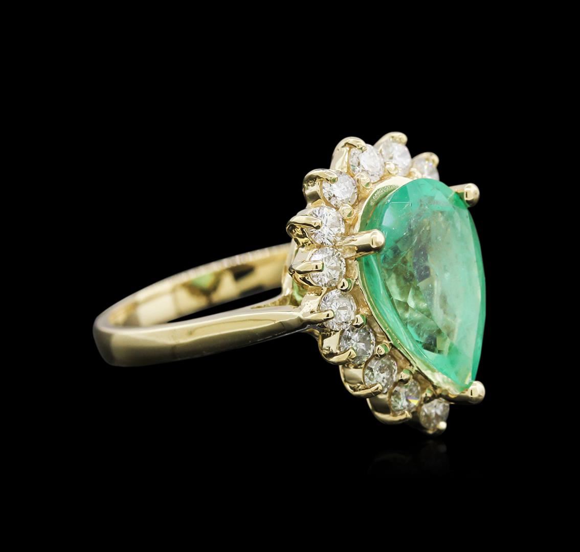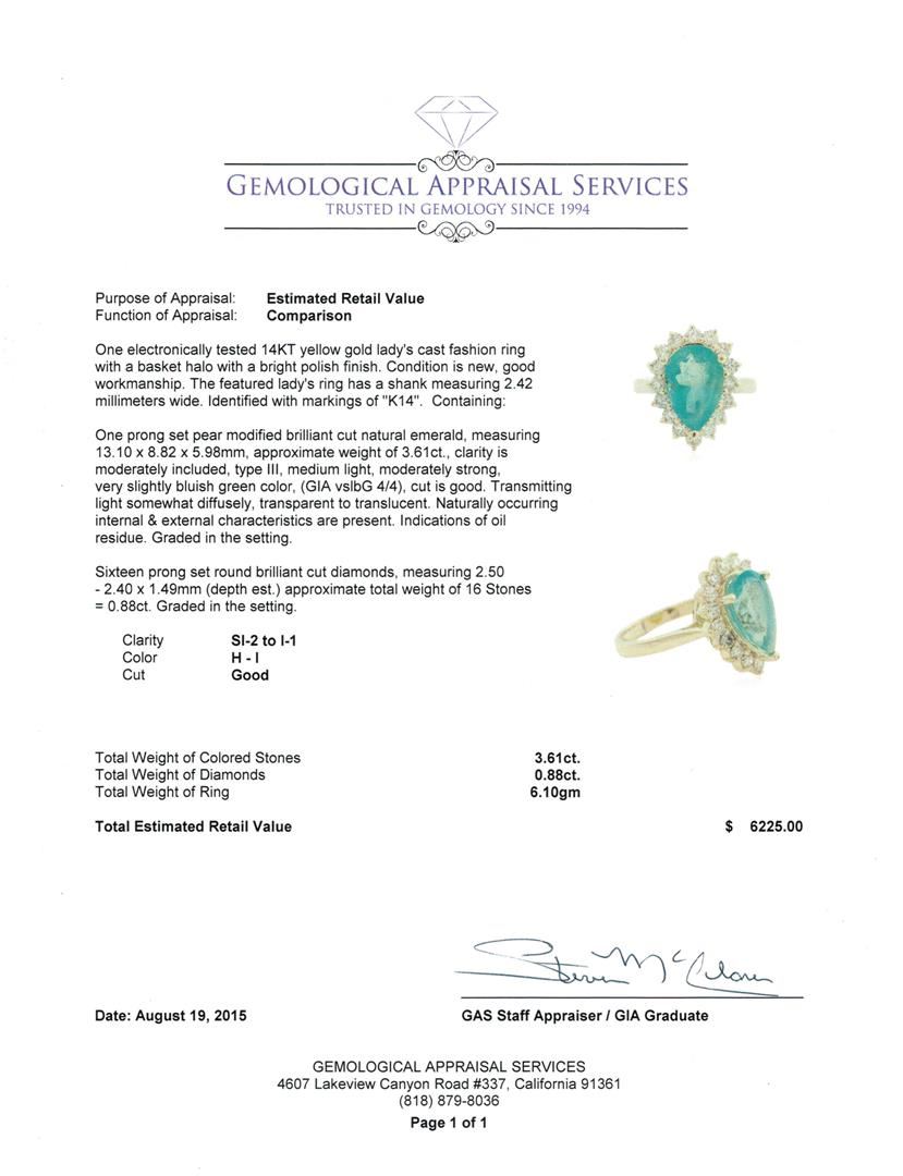 One electronically tested 14KT yellow gold lady's cast fashion ring with a basket halo with a bright polish finish. The featured lady's ring has a shank measuring 2.42 millimeters wide. Identified with markings of "K14". Condition is new, good workmanship. Containing: One prong set pear modified brilliant cut natural emerald, measuring 13.10 x 8.82 x 5.98mm, approximate weight of 3.61ct., clarity is moderately included, type III, medium light, moderately strong, very slightly bluish green color, (GIA vslbG 4/4), cut is good. Transmitting light somewhat diffusely, transparent to translucent. Naturally occurring internal & external characteristics are present. Indications of oil residue. Graded in the setting. Sixteen prong set round brilliant cut diamonds, measuring 2.50 - 2.40 x 1.49mm (depth est.) approximate total weight of 16 Stones = 0.88ct. Graded in the setting. Clarity: SI-2 to I-1. Color: H - I. Cut Good. Total Weight of Colored Stones 3.61ct. Total Weight of Diamonds 0.88ct. Total Weight of Ring 6.10gm. GAS Appraised at $6,225.00.