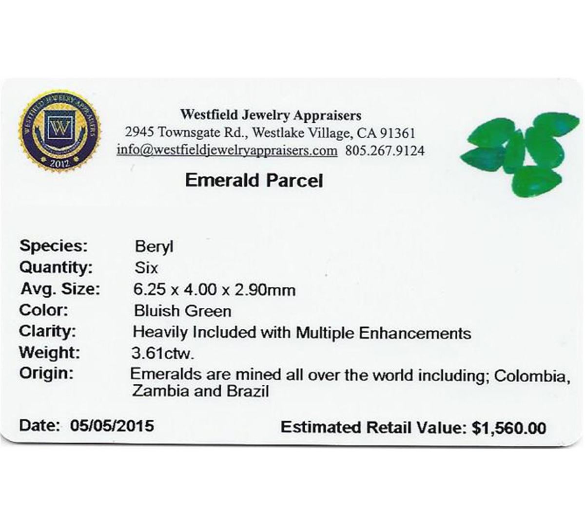 Five pear mixed cut natural emeralds, measuring 6.25 x 4.00 x 2.90mm, approximate total weight of 3.61ct., clarity is heavily included, type III, medium dark, very slightly grayish, bluish green color, (GIA bG 6/3), cut is good. Indications of multiple laboratory enhancements, including high temperature heat treatment. Westfield Appraised at $1,560.00.