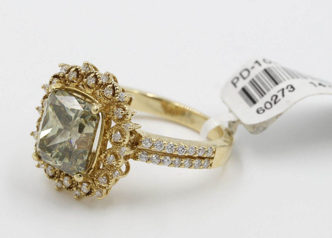 One lady's ring featuring: 14KT yellow gold weighing 5.38 grams containing one green diamond weighing 3.62ct and 56 white diamonds weighing 0.36ctw. The green diamond is cushion shaped with an excellent cut, SI-1 clarity and fancy light green color. The s