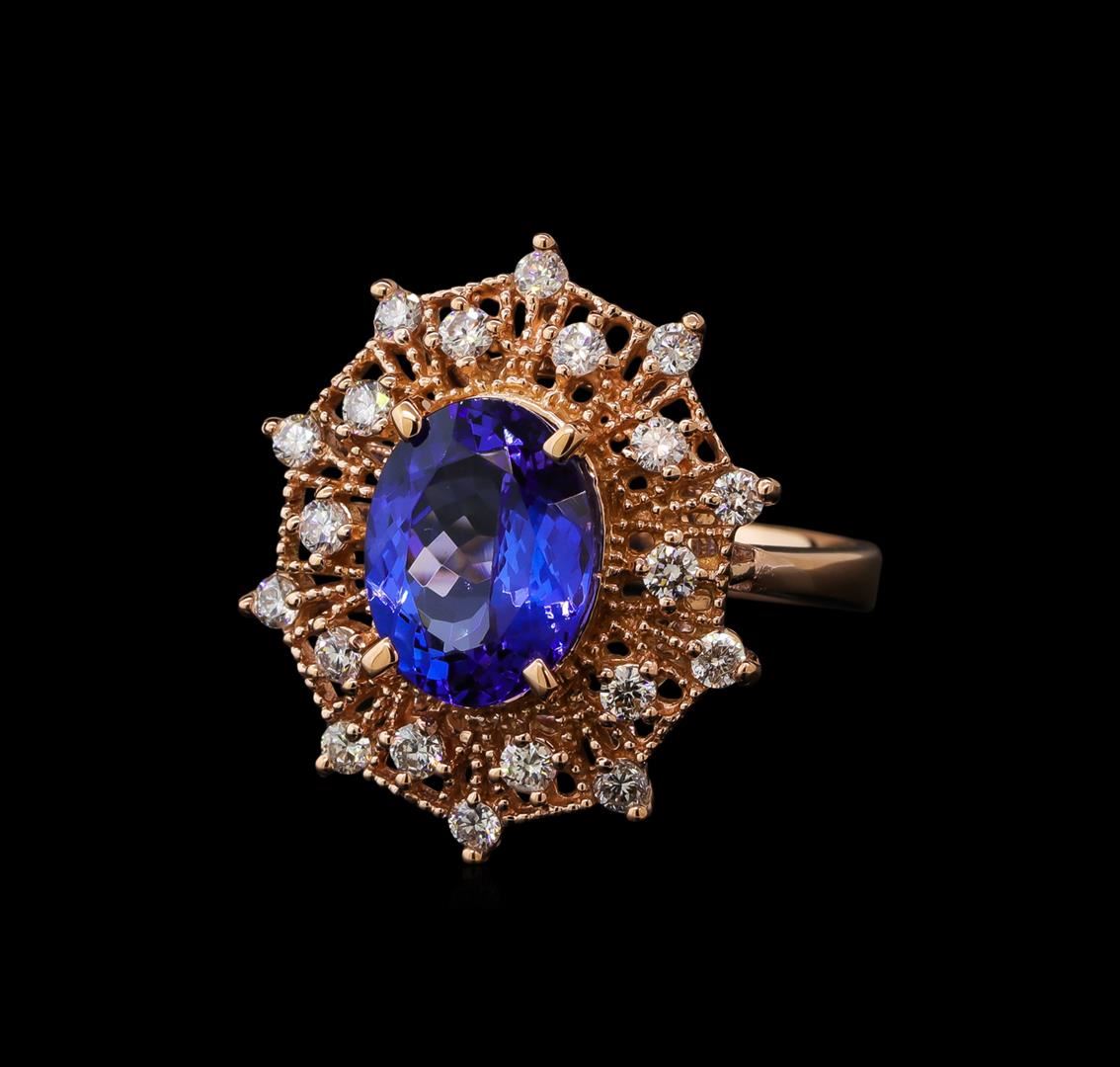 One electronically tested 14KT rose gold lady's cast fashion ring with a double basket halo with a bright polish with milgrain detailing finish. The featured lady's ring has a shank measuring 2.80 millimeters wide. Identified with markings of 'K14'. Condition is new, good workmanship. Containing: One prong set oval modified brilliant cut natural tanzanite, measuring 11.02 x 8.53 x 5.25mm, (depth est.) 5%. bulge factor, approximate weight of 3.62ct., clarity is eye clean, medium dark, moderately strong, violetish blue color, (GIA vB 6/4), cut is very good. Transmitting light with no distortion, transparent. Colored gemstones are presumed to have been subjected to commonly used enhancement processes. Graded in the setting. Twenty prong set round brilliant cut diamonds, measuring 2.10 - 1.95 x 1.24mm (depth est.) approximate total weight of 20 Stones = 0.62ct. Graded in the setting. Clarity SI-1 to SI-2. Color: H - I Cut Good. Total Weight of Colored Stones 3.62ct. Total Weight of Diamonds 0.62ct. Total Weight of Ring 6.40gm. GAS Appraised at $8,625.00.