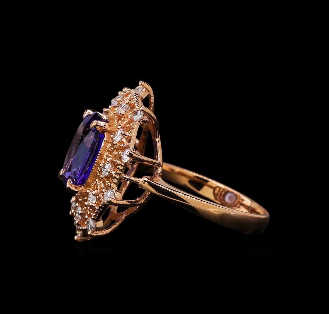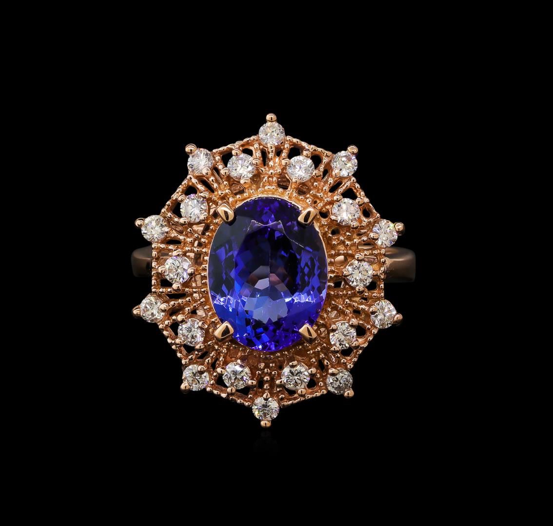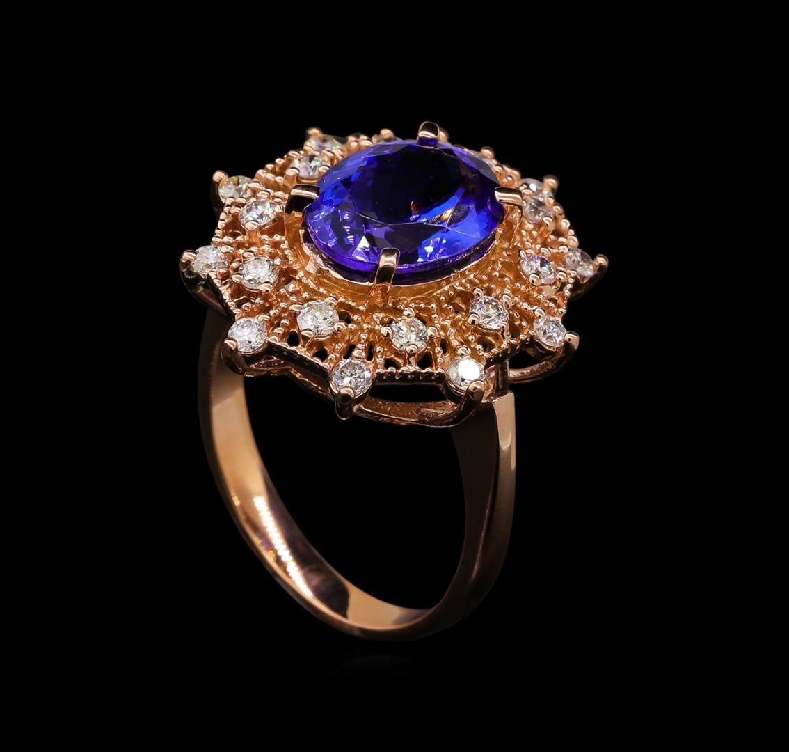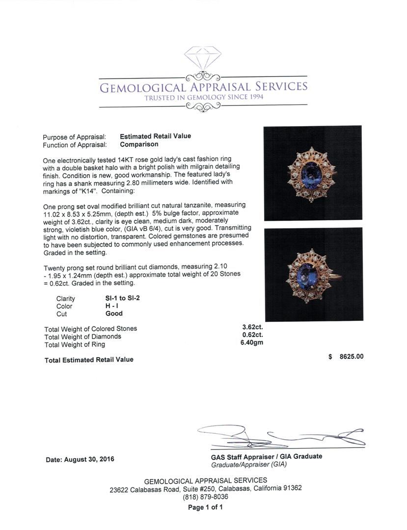 One electronically tested 14KT rose gold lady's cast fashion ring with a double basket halo with a bright polish with milgrain detailing finish. The featured lady's ring has a shank measuring 2.80 millimeters wide. Identified with markings of 'K14'. Condition is new, good workmanship. Containing: One prong set oval modified brilliant cut natural tanzanite, measuring 11.02 x 8.53 x 5.25mm, (depth est.) 5%. bulge factor, approximate weight of 3.62ct., clarity is eye clean, medium dark, moderately strong, violetish blue color, (GIA vB 6/4), cut is very good. Transmitting light with no distortion, transparent. Colored gemstones are presumed to have been subjected to commonly used enhancement processes. Graded in the setting. Twenty prong set round brilliant cut diamonds, measuring 2.10 - 1.95 x 1.24mm (depth est.) approximate total weight of 20 Stones = 0.62ct. Graded in the setting. Clarity SI-1 to SI-2. Color: H - I Cut Good. Total Weight of Colored Stones 3.62ct. Total Weight of Diamonds 0.62ct. Total Weight of Ring 6.40gm. GAS Appraised at $8,625.00.