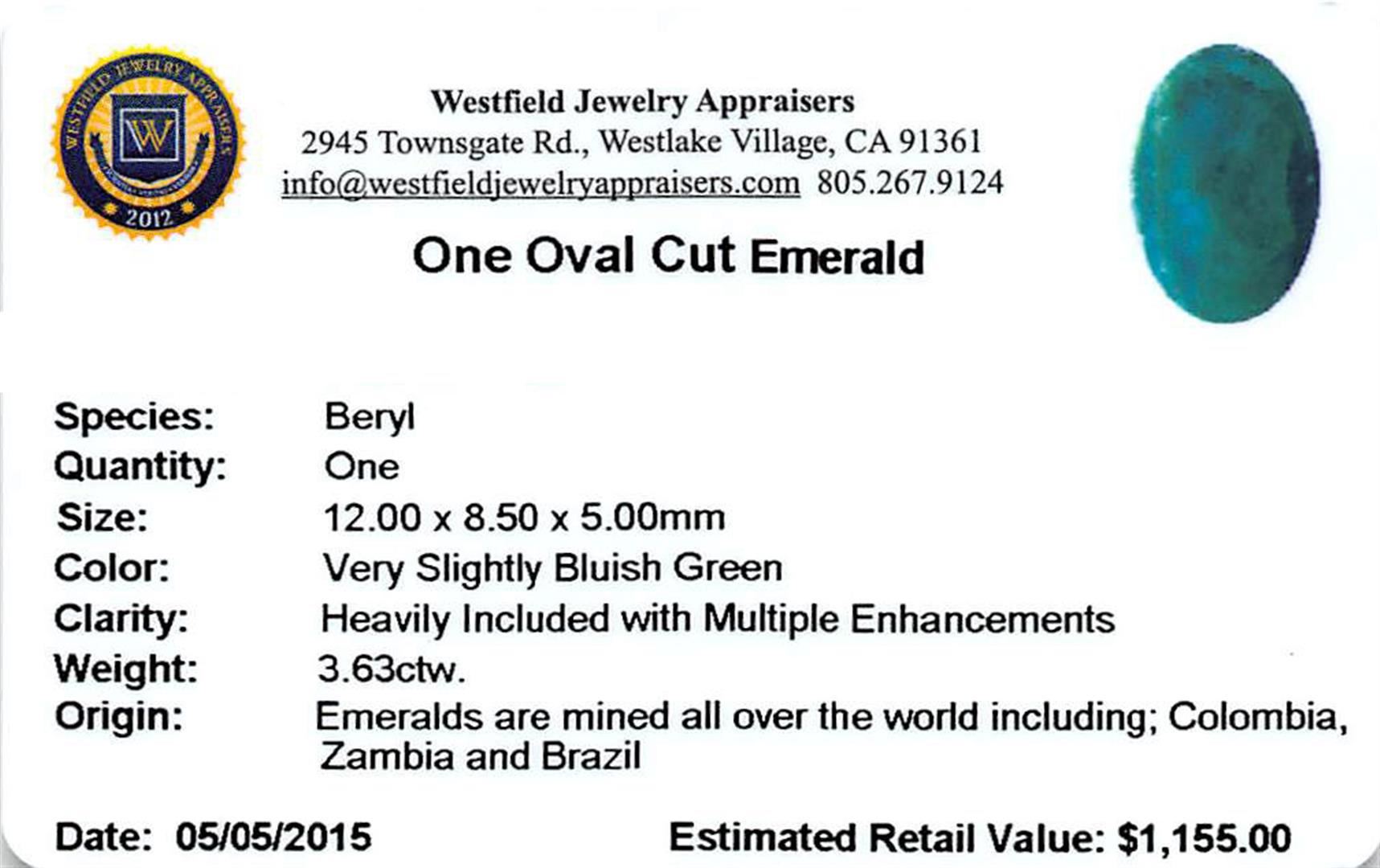 One oval mixed cut natural emerald, measuring 12.00 x 8.50 x 5.00mm, exact weight 3.63ct., clarity is heavily included, type III, medium dark, very slightly grayish, very slightly bluish green color, (GIA vslbG 6/3), cut is good. Westfield Appraised.