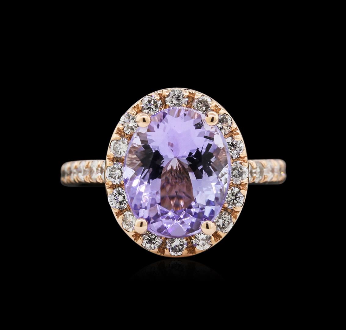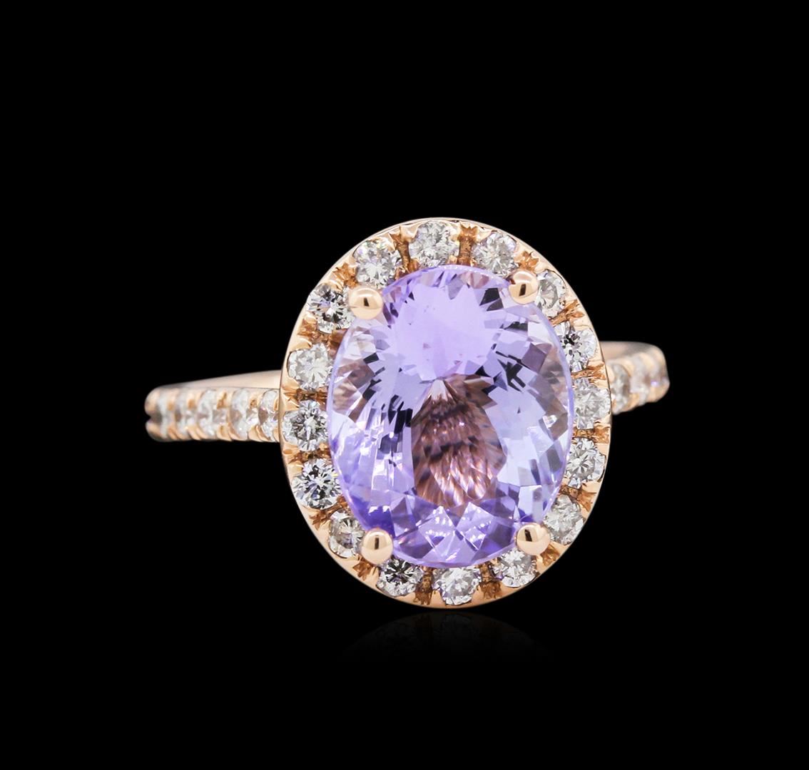One electronically tested 14KT rose gold lady's cast fashion ring with a cathedral shank with a halo with a bright polish finish. The featured lady's ring has a shank measuring 2.17 millimeters wide. Identified with markings of "14K". Condition is new, good workmanship. Containing: One prong set oval modified brilliant cut natural tanzanite, measuring 11.01 x 9.03 x 5.40mm, approximate weight of 3.63ct., clarity is eye clean, type I, medium light, very slightly grayish, bluish violet color, (GIA bV 4/3), cut is good. Transmitting light with no distortion, transparent. Colored gemstones are presumed to have been subjected to commonly used enhancement processes. Graded in the setting. Thirty-Four prong set round brilliant cut diamonds, measuring 2.00 - 1.90 x 1.17mm (depth est.) approximate total weight of 34 Stones = 0.93ct. Graded in the setting. Clarity: SI-1 to I-1. Color: H - Good. Total Weight of Colored Stones 3.63ct. Total Weight of Diamonds 0.93ct. Total Weight of Ring 4.50gm. GAS Appraised at $6,075.00.