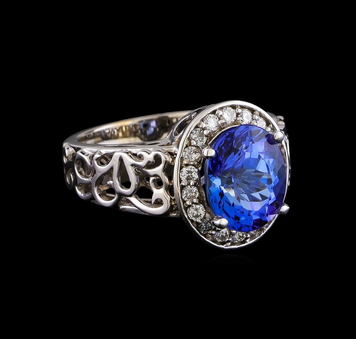 One electronically tested 14KT white gold lady's cast fashion ring with a cathedral shank with a bright polish finish. The featured lady's ring has a filagree shank measuring 3.36 millimeters in width. Identified with markings of "14K". Condition is new, good workmanship. Containing: One prong set oval modified brilliant cut natural tanzanite, measuring 10.33 x 8.54 x 5.54mm, (depth est.) 8%. bulge factor, approximate weight of 3.63ct., clarity is eye clean, medium dark, moderately strong, bluish violet color, (GIA bV 6/4), cut is very good. Transmitting light with no distortion, transparent. Colored gemstones are presumed to have been subjected to commonly used enhancement processes. Graded in the setting. Eighteen prong set round brilliant cut diamonds, measuring 1.80 - 1.70 x 1.08mm (depth est.) approximate total weight of 18 Stones = 0.35ct. Graded in the setting. Clarity: SI-1 to SI-2. Color: H - I. Cut Good. Total Weight of Colored Stones 3.63ct. Total Weight of Diamonds 0.35ct. Total Weight of Ring 6.20gm. GAS Appraised at $7,890.00.
