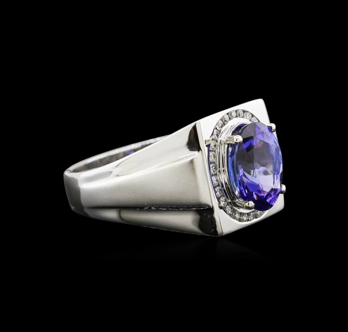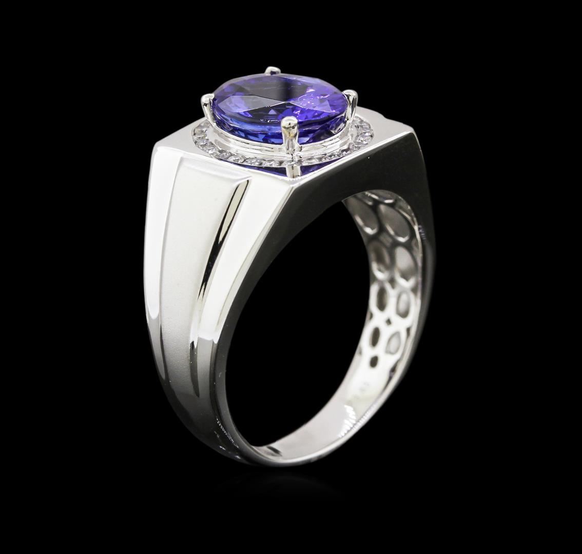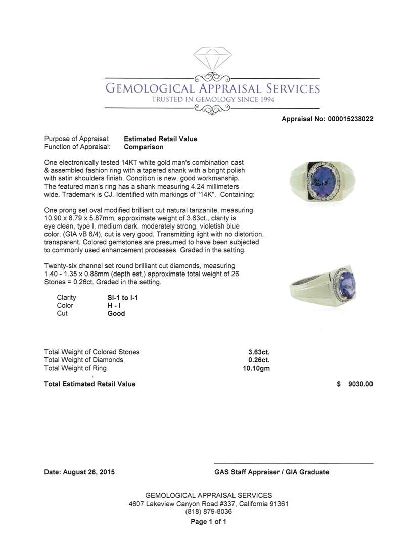 One electronically tested 14KT white gold man's combination cast & assembled fashion ring with a tapered shank with a bright polish with satin shoulders finish. The featured man's ring has a shank measuring 4.24 millimeters wide. Trademark is CJ. Identified with markings of "14K". Condition is new, good workmanship. Containing: One prong set oval modified brilliant cut natural tanzanite, measuring 10.90 x 8.79 x 5.87mm, approximate weight of 3.63ct., clarity is eye clean, type I, medium dark, moderately strong, violetish blue color, (GIA vB 6/4), cut is very good. Transmitting light with no distortion, transparent. Colored gemstones are presumed to have been subjected to commonly used enhancement processes. Graded in the setting. Twenty-Six channel set round brilliant cut diamonds, measuring 1.40 - 1.35 x 0.88mm (depth est.) approximate total weight of 26 Stones = 0.26ct. Graded in the setting. Clarity: SI-1 to I-1. Color: H - I. Cut Good. Total Weight of Colored Stones 3.63ct. Total Weight of Diamonds 0.26ct. Total Weight of Ring 10.10gm. GAS Appraised at $9,030.00.
