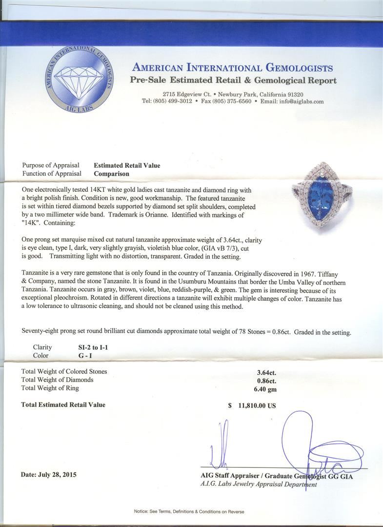 One electronically tested 14KT white gold ladies cast tanzanite and diamond ring with a bright polish finish. The featured tanzanite is set within tiered diamond bezels supported by diamond set split shoulders, completed by a two millimeter wide band. Trademark is Orianne. Identified with markings of "14K". Condition is new, good workmanship. Containing: One prong set marquise mixed cut natural tanzanite approximate weight of 3.64ct., clarity is eye clean, type I, dark, very slightly grayish, violetish blue color, (GIA vB 7/3), cut is good. Transmitting light with no distortion, transparent. Graded in the setting. Tanzanite is a very rare gemstone that is only found in the country of Tanzania. Originally discovered in 1967. Tiffany & Company, named the stone Tanzanite. It is found in the Usumburu Mountains that border the Umba Valley of northern Tanzania. Tanzanite occurs in gray, brown, violet, blue, reddish-purple, & green. The gem is interesting because of its exceptional pleochroism. Rotated in different directions a tanzanite will exhibit multiple changes of color. Tanzanite has a low tolerance to ultrasonic cleaning, and should not be cleaned using this method. Seventy-Eight prong set round brilliant cut diamonds approximate total weight of 78 Stones = 0.86ct. Graded in the setting. Clarity: SI-2 to I-1. Color: G - I. Total Weight of Colored Stones 3.64ct. Total Weight of Diamonds 0.86ct. Total Weight of Ring 6.40gm. AIG Appraised at $11,810.00.