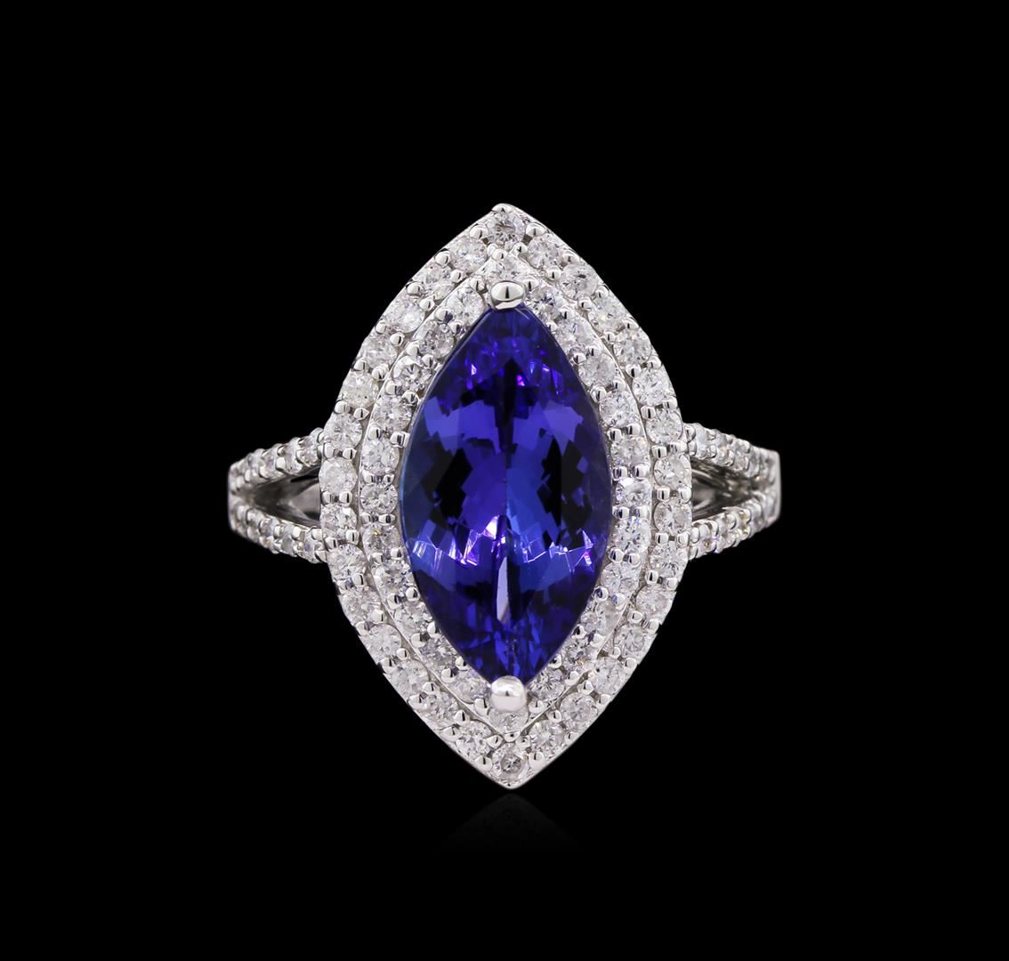 One electronically tested 14KT white gold ladies cast tanzanite and diamond ring with a bright polish finish. The featured tanzanite is set within tiered diamond bezels supported by diamond set split shoulders, completed by a two millimeter wide band. Trademark is Orianne. Identified with markings of "14K". Condition is new, good workmanship. Containing: One prong set marquise mixed cut natural tanzanite approximate weight of 3.64ct., clarity is eye clean, type I, dark, very slightly grayish, violetish blue color, (GIA vB 7/3), cut is good. Transmitting light with no distortion, transparent. Graded in the setting. Tanzanite is a very rare gemstone that is only found in the country of Tanzania. Originally discovered in 1967. Tiffany & Company, named the stone Tanzanite. It is found in the Usumburu Mountains that border the Umba Valley of northern Tanzania. Tanzanite occurs in gray, brown, violet, blue, reddish-purple, & green. The gem is interesting because of its exceptional pleochroism. Rotated in different directions a tanzanite will exhibit multiple changes of color. Tanzanite has a low tolerance to ultrasonic cleaning, and should not be cleaned using this method. Seventy-Eight prong set round brilliant cut diamonds approximate total weight of 78 Stones = 0.86ct. Graded in the setting. Clarity: SI-2 to I-1. Color: G - I. Total Weight of Colored Stones 3.64ct. Total Weight of Diamonds 0.86ct. Total Weight of Ring 6.40gm. AIG Appraised at $11,810.00.
