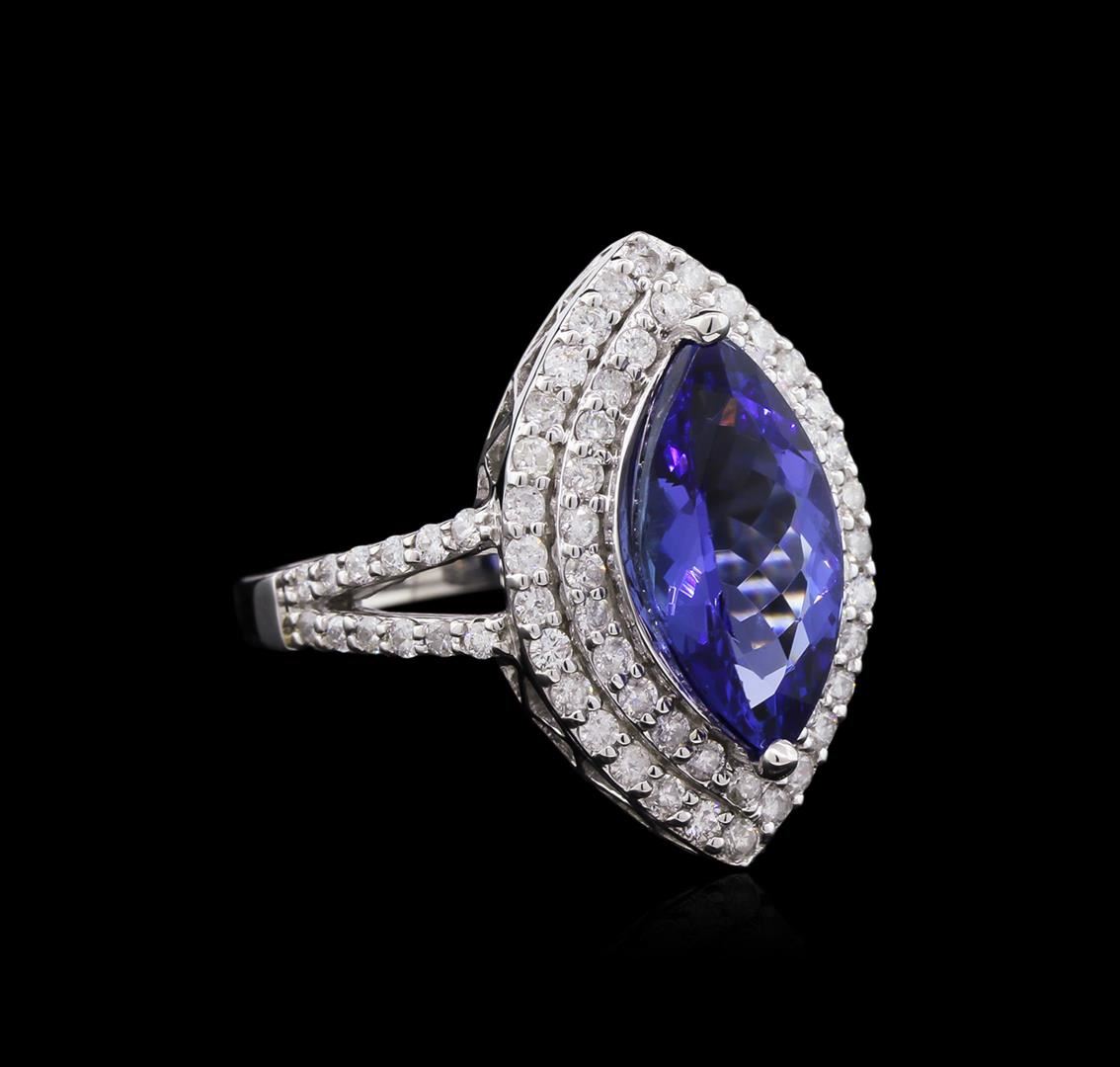 One electronically tested 14KT white gold ladies cast tanzanite and diamond ring with a bright polish finish. The featured tanzanite is set within tiered diamond bezels supported by diamond set split shoulders, completed by a two millimeter wide band. Trademark is Orianne. Identified with markings of "14K". Condition is new, good workmanship. Containing: One prong set marquise mixed cut natural tanzanite approximate weight of 3.64ct., clarity is eye clean, type I, dark, very slightly grayish, violetish blue color, (GIA vB 7/3), cut is good. Transmitting light with no distortion, transparent. Graded in the setting. Tanzanite is a very rare gemstone that is only found in the country of Tanzania. Originally discovered in 1967. Tiffany & Company, named the stone Tanzanite. It is found in the Usumburu Mountains that border the Umba Valley of northern Tanzania. Tanzanite occurs in gray, brown, violet, blue, reddish-purple, & green. The gem is interesting because of its exceptional pleochroism. Rotated in different directions a tanzanite will exhibit multiple changes of color. Tanzanite has a low tolerance to ultrasonic cleaning, and should not be cleaned using this method. Seventy-Eight prong set round brilliant cut diamonds approximate total weight of 78 Stones = 0.86ct. Graded in the setting. Clarity: SI-2 to I-1. Color: G - I. Total Weight of Colored Stones 3.64ct. Total Weight of Diamonds 0.86ct. Total Weight of Ring 6.40gm. AIG Appraised at $11,810.00.