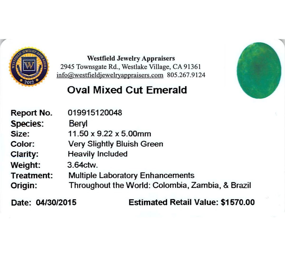 One oval mixed cut natural emerald, measuring 11.50 x 9.22 x 5.50mm, exact weight 3.64ct., clarity is heavily included, type III, medium dark, very slightly grayish, very slightly bluish green color, (GIA vslbG 6/3), cut is good. Indications of multiple laboratory enhancements, including high temperature heat treatment. Westfield Appraised at $1,570.00.