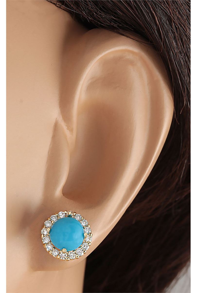 Stamped: 14K Total Earring Weight: 2.00Grams Diamond Weight: Total natural diamond weight is .65carat. SI1-SI2 clarity / G-H color Gemstone Weight: Total Natural Turquoise Weight is 3.00ctw (Measures: 7.20x7.20mm) Main Stone Color: Blue Face Measure: 10.50x10.50mm SKU: [703343]