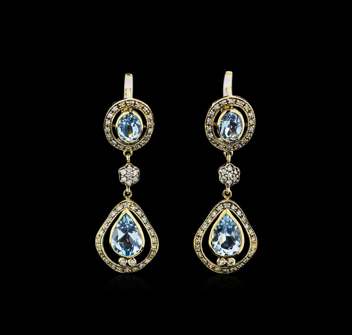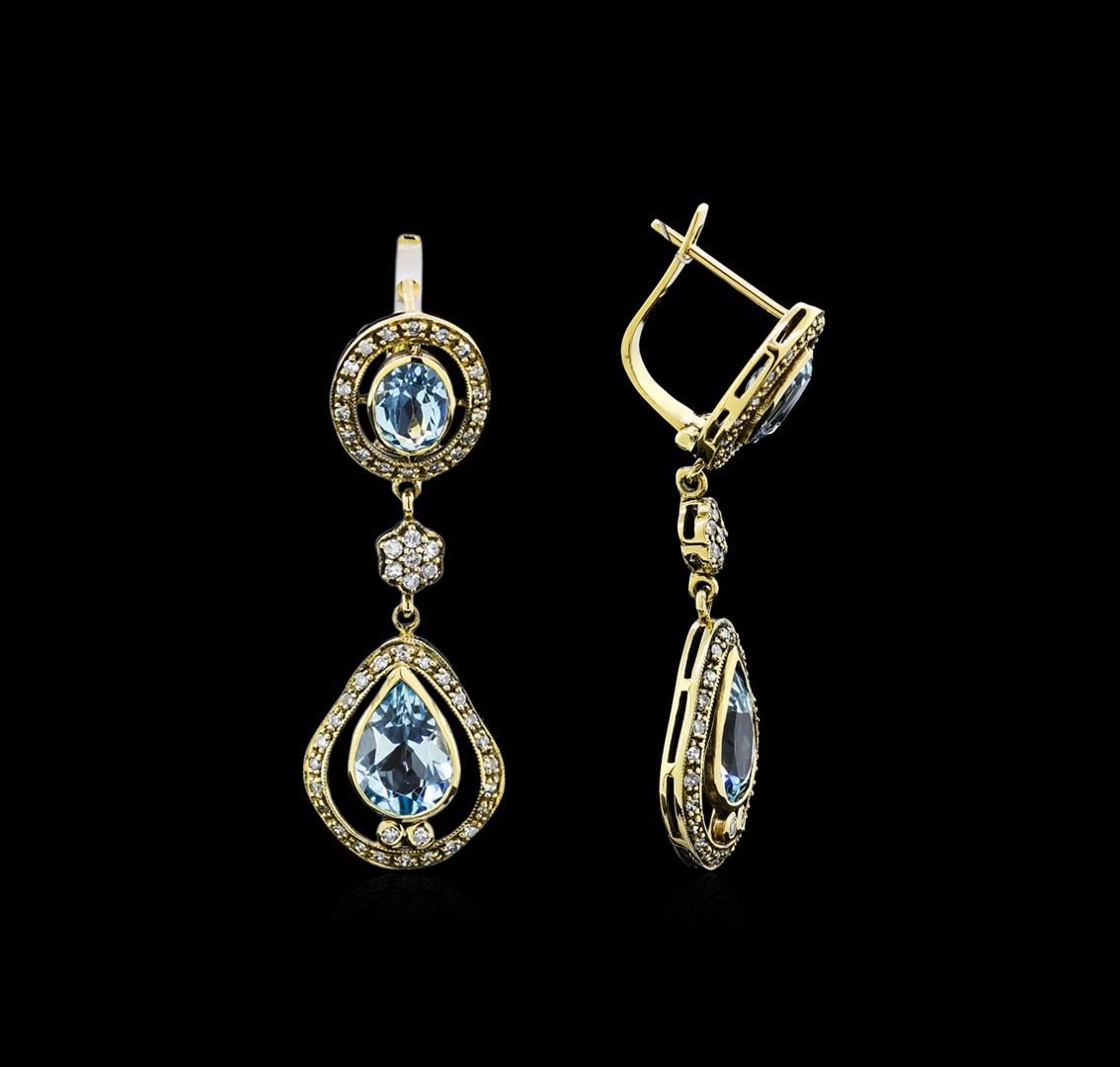 One pair of earrings featuring: 18KT yellow gold weighing 7.70 grams containing blue topaz with a total weight of 3.65ct and diamonds with a total weight of 0.62ct.