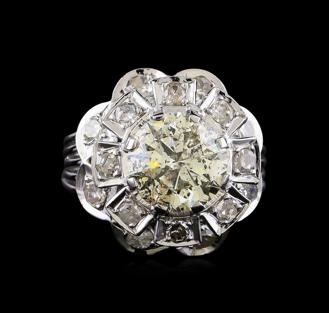 One electronically tested 18KT white gold ladies cast & assembled diamond cluster ring with a bright polish finish. The featured diamond is set within a two-tiered diamond floret supported by five-way split shoulders, completed by a two and one-half millimeter wide band. Condition is new, good workmanship. Containing: One prong set round brilliant cut diamond, measuring 9.10 - 9.10 x 5.70mm (depth est.) approximate weight of 2.88ct with a strong blue fluorescence. Graded in the setting. Clarity: I-2. Depth: 62.6%. Table 59.3%. Eight prong set single cut diamonds, measuring 2.50 - 2.50 x 1.50mm (depth est.) approximate total weight of 8 Stones = 0.46ct. Color & clarity grade are an average for the group. Graded in the setting. Clarity: I-2. Color: I - K Eight prong set single cut diamonds, measuring 2.20 - 2.20 x 1.32mm (depth est.) approximate total weight of 8 Stones = 0.31ct. Color & clarity grade are an average for the group. Graded in the setting. Clarity: I-2. Color: H - I. Total Weight of Diamonds 3.65ct. Total Weight of Ring 9.04gm. AIG Appraised at $23,300.00.
