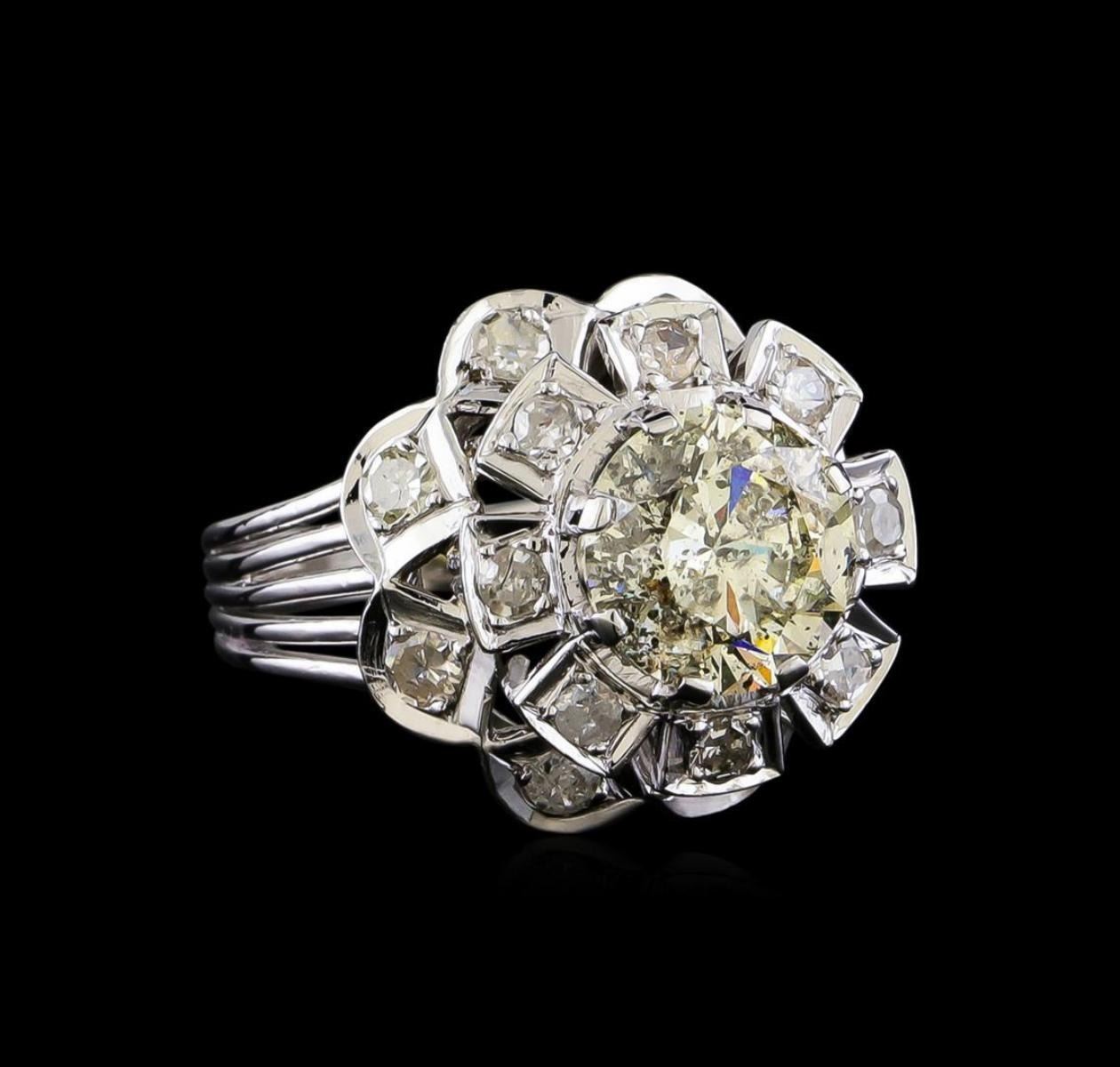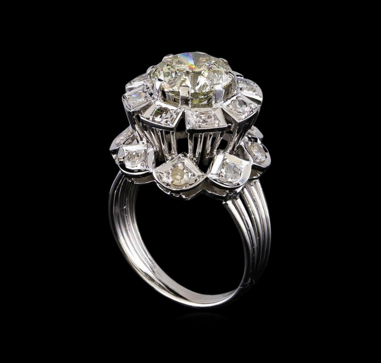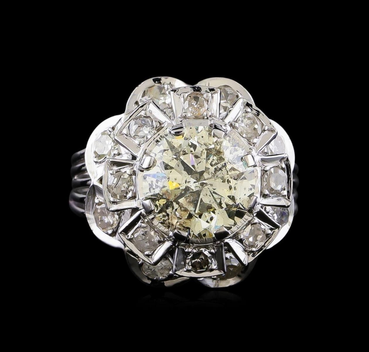 One electronically tested 18KT white gold ladies cast & assembled diamond cluster ring with a bright polish finish. The featured diamond is set within a two-tiered diamond floret supported by five-way split shoulders, completed by a two and one-half millimeter wide band. Condition is new, good workmanship. Containing: One prong set round brilliant cut diamond, measuring 9.10 - 9.10 x 5.70mm (depth est.) approximate weight of 2.88ct with a strong blue fluorescence. Graded in the setting. Clarity: I-2. Depth: 62.6%. Table 59.3%. Eight prong set single cut diamonds, measuring 2.50 - 2.50 x 1.50mm (depth est.) approximate total weight of 8 Stones = 0.46ct. Color & clarity grade are an average for the group. Graded in the setting. Clarity: I-2. Color: I - K Eight prong set single cut diamonds, measuring 2.20 - 2.20 x 1.32mm (depth est.) approximate total weight of 8 Stones = 0.31ct. Color & clarity grade are an average for the group. Graded in the setting. Clarity: I-2. Color: H - I. Total Weight of Diamonds 3.65ct. Total Weight of Ring 9.04gm. AIG Appraised.