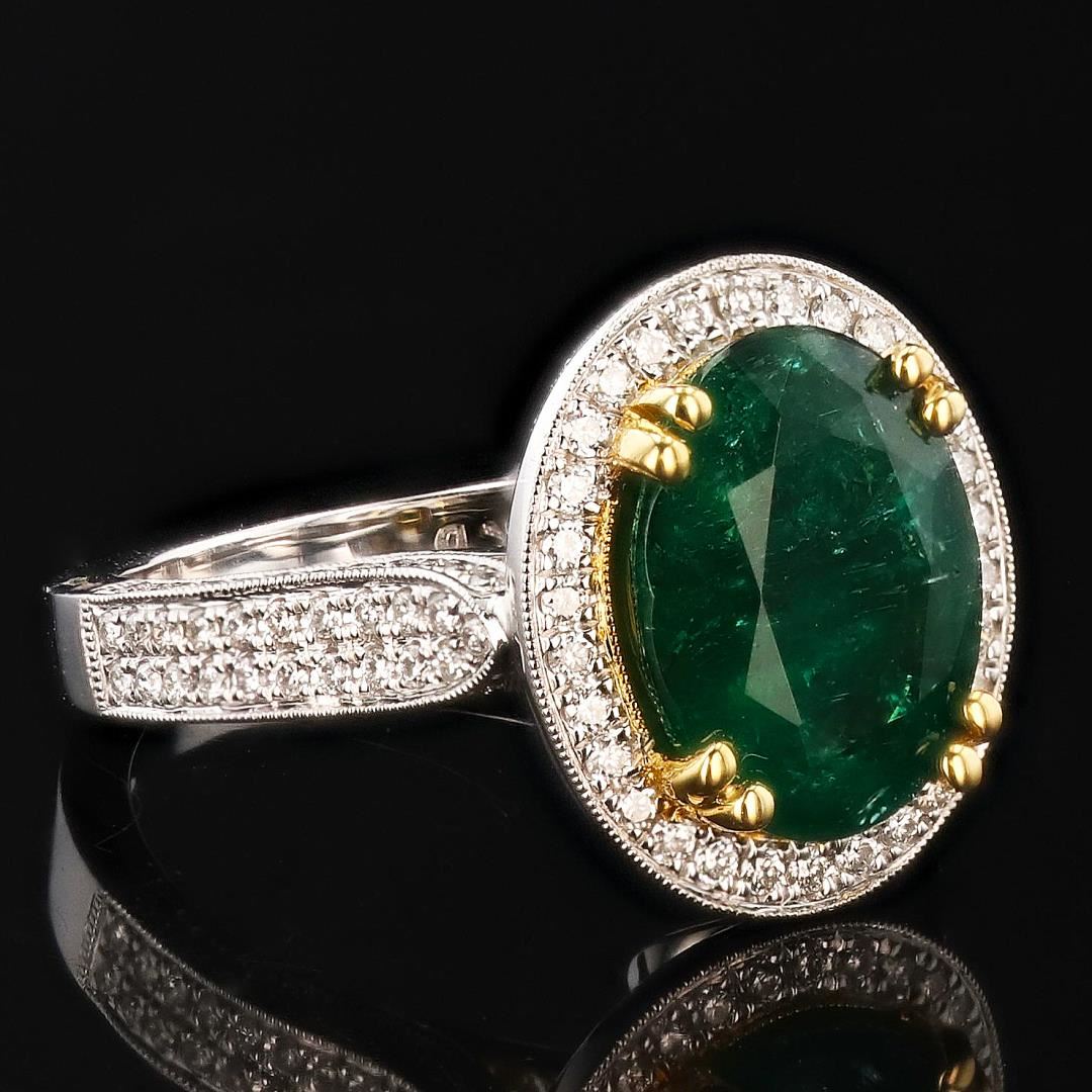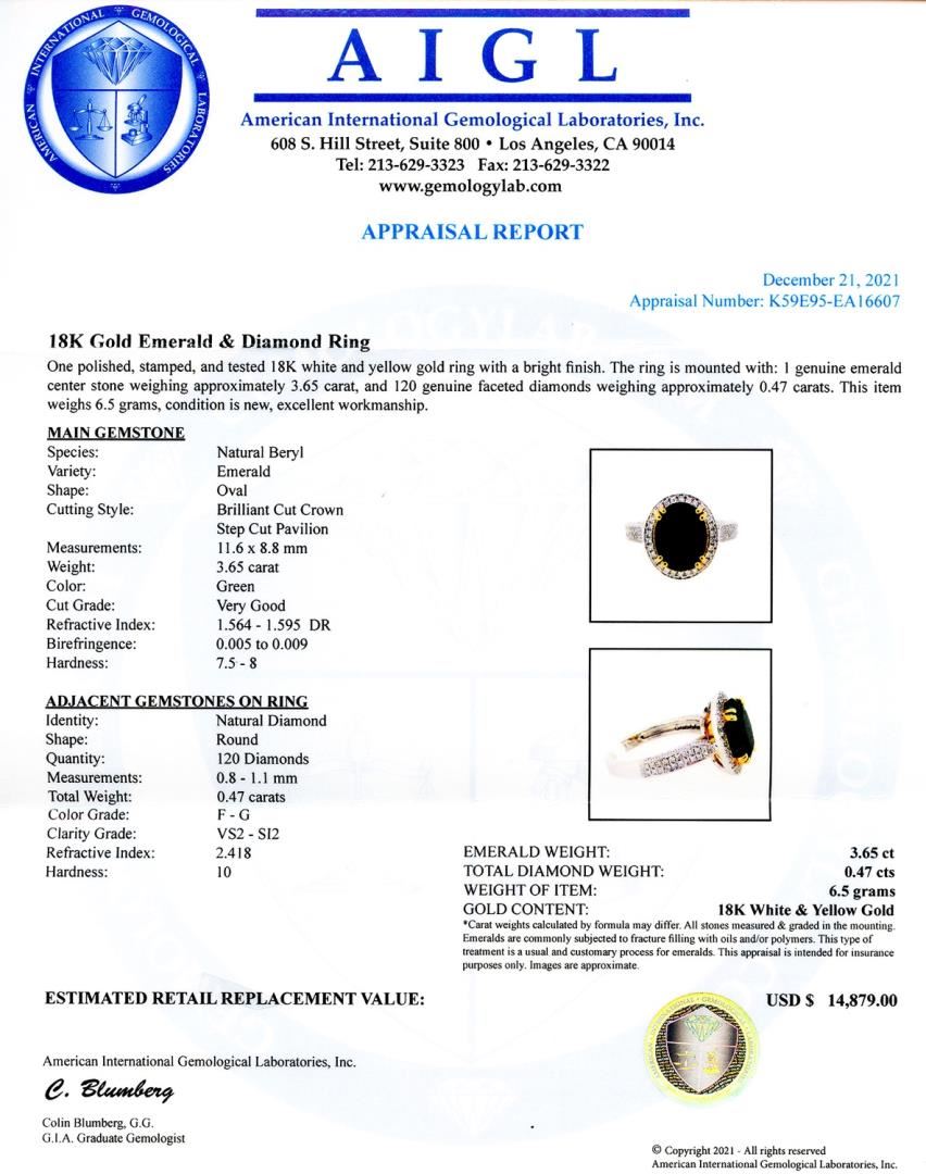 One polished, stamped, and tested 18K white and yellow gold ring with a bright finish. The ring is mounted with: 1 genuine emerald center stone weighing approximately 3.65 carat, and 120 genuine faceted diamonds weighing approximately 0.47 carats. This item weighs 6.5 grams, condition is new, excellent workmanship. MAIN GEMSTONE Species: Natural Beryl Variety: Emerald Shape: Oval Cutting Style: Brilliant Cut Crown Step Cut Pavilion Measurements: 11.6 x 8.8mm Weight: 3.65 carat Color: Green Cut Grade: Very Good Refractive Index: 1.564 - 1.595 DR Birefringence: 0.005 to 0.009 Hardness: 7.5 - 8 ADJACENT GEMSTONES ON RING Identity: Natural Diamond Shape: Round Quantity: 120 Diamonds Measurements: 0.8 - 1.1mm Total Weight: 0.47 carats Color Grade: F - G Clarity Grade: VS2 to SI2 Refractive Index: 2.418 Hardness: 10 EMERALD WEIGHT: 3.65ct TOTAL DIAMOND WEIGHT: 0.47ctw WEIGHT OF ITEM: 6.5 grams GOLD CONTENT: 18K White & Yellow Gold #Size: 6 1/2