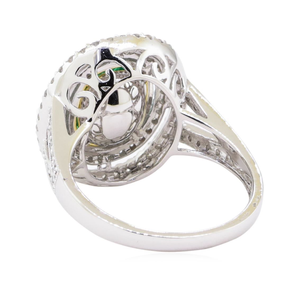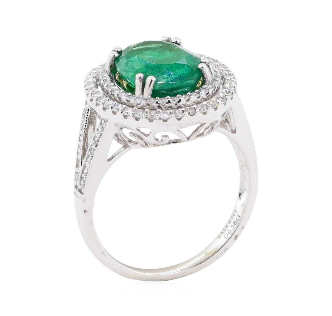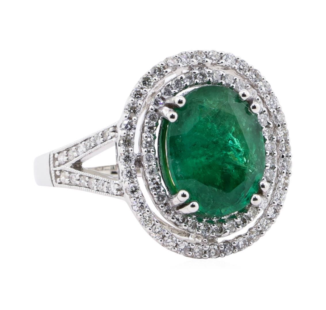 One 14k White Gold Emerald and Diamond ring weighing approx. 5.40 grams. Containing: One Green (GLA G 5/4) hue, medium tone, moderately strong saturation, Type III, Oval cut Emerald Weighing approx. 3.65 carats. measuring approx. 10.95 X 8.65 mm and 92 Round Brilliant cut Diamonds total approx. 0.58 carat, with an average quality of SI2II; G-H color grade Gem Type: Emerald Shape/cut: Oval cut Carat weight: Approx. 3.65 carat Measurements: Approx. 10.95 x 8.65 mm Setting: Prong set Gem Type: Diamond Shape/ cut: Round Brilliant cut Carat weight: Total approx. 0.58 carat Color: G-H Clarity: S1211 Metal Content: 14k White Gold Setting: Prong set ESTIMATED RETAIL REPLACEMENT VALUE: $10, 698.00 US