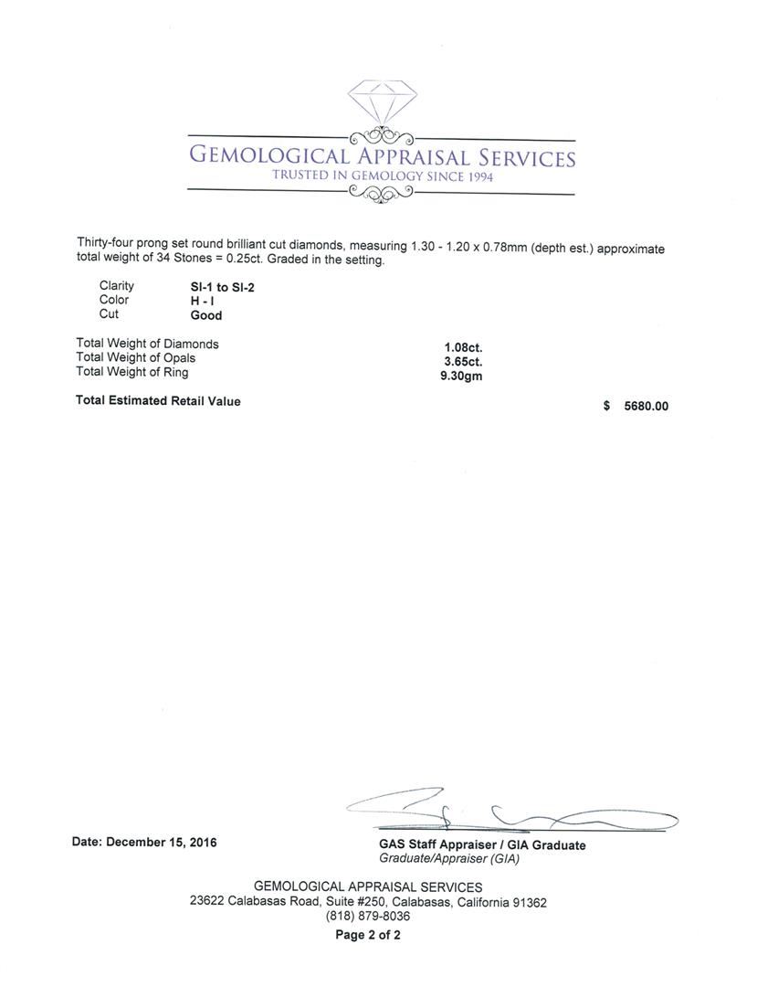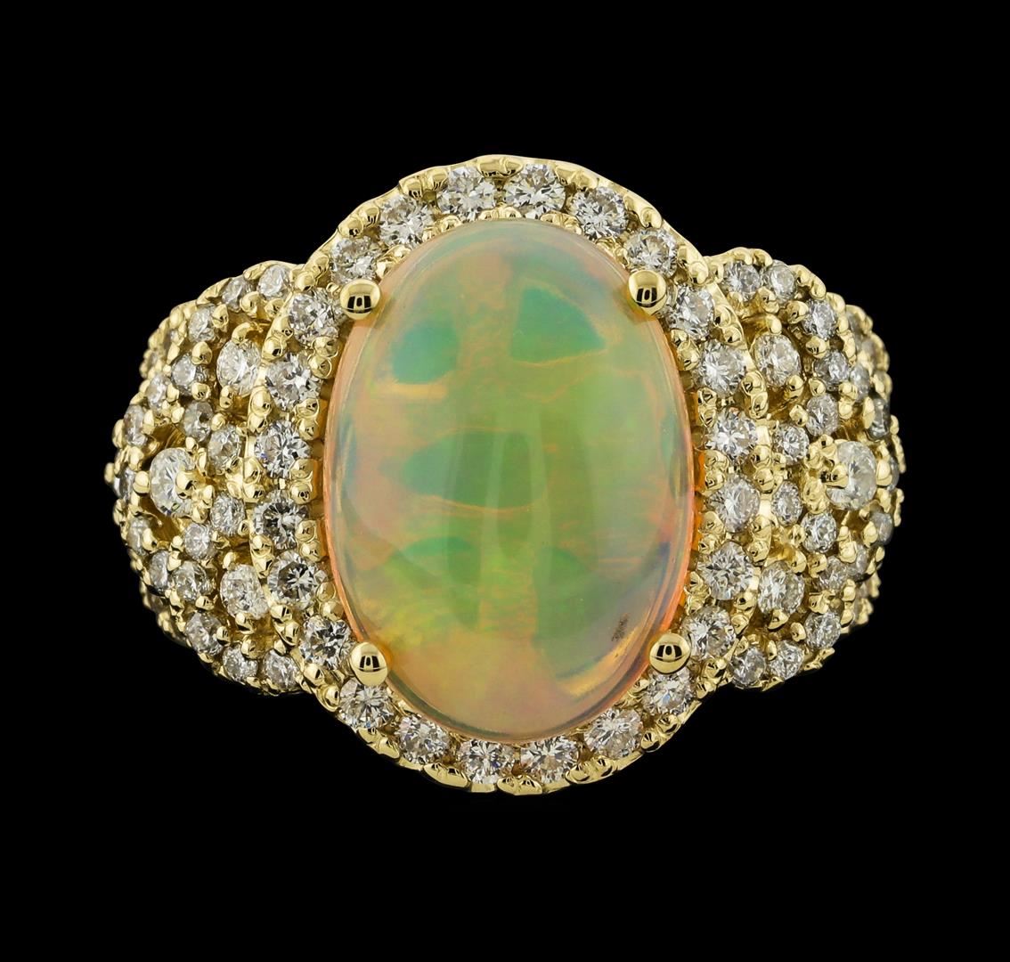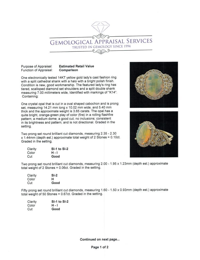 One electronically tested 14KT yellow gold lady's cast fashion ring with a split cathedral shank with a halo with a bright polish finish. The featured lady's ring has tiered, scalloped diamond set shoulders and a split double shank measuring 7.00 millimeters wide, Identified with markings of 'K14'. Condition is new, good workmanship. Containing: One crystal opal that is cut in a oval shaped cabochon and is prong set, measuring 14.21 mm long x 10.02 mm wide, and 5.40 mm thick and the approximate weight is 3.65 carats. The opal has a quite bright, orange-green play of color (fire) in a rolling flashfire pattern; a medium dome; a good cut; no inclusions; consistent in its brightness and pattern; and is not directional. Graded in the setting. Two prong set round brilliant cut diamonds, measuring 2.35 - 2.30 x 1.44mm (depth est.) approximate total weight of 2 Stones = 0.10ct. Graded in the setting. Clarity SI-1 to SI-2. Color: H - I Cut Good Two prong set round brilliant cut diamonds, measuring 2.00 - 1.95 x 1.23mm (depth est.) approximate total weight of 2 Stones = 0.06ct. Graded in the setting. Clarity SI-2. Color: H Cut Good Fifty prong set round brilliant cut diamonds, measuring 1.60 - 1.50 x 0.93mm (depth est.) approximate total weight of 50 Stones = 0.67ct. Graded in the setting. Clarity SI-1 to SI-2. Color: H - I Cut Good Thirty-Four prong set round brilliant cut diamonds, measuring 1.30 - 1.20 x 0.78mm (depth est.) approximate total weight of 34 Stones = 0.25ct. Graded in the setting. Clarity SI-1 to SI-2. Color: H - I Cut Good. Total Weight of Diamonds 1.08ct.. Total Weight of Opals 3.65ct.. Total Weight of Ring 9.30gm. GAS Appraised at $5,680.00.
