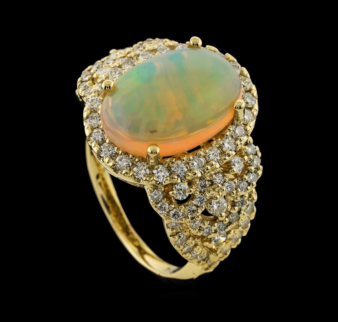 One electronically tested 14KT yellow gold lady's cast fashion ring with a split cathedral shank with a halo with a bright polish finish. The featured lady's ring has tiered, scalloped diamond set shoulders and a split double shank measuring 7.00 millimeters wide, Identified with markings of 'K14'. Condition is new, good workmanship. Containing: One crystal opal that is cut in a oval shaped cabochon and is prong set, measuring 14.21 mm long x 10.02 mm wide, and 5.40 mm thick and the approximate weight is 3.65 carats. The opal has a quite bright, orange-green play of color (fire) in a rolling flashfire pattern; a medium dome; a good cut; no inclusions; consistent in its brightness and pattern; and is not directional. Graded in the setting. Two prong set round brilliant cut diamonds, measuring 2.35 - 2.30 x 1.44mm (depth est.) approximate total weight of 2 Stones = 0.10ct. Graded in the setting. Clarity SI-1 to SI-2. Color: H - I Cut Good Two prong set round brilliant cut diamonds, measuring 2.00 - 1.95 x 1.23mm (depth est.) approximate total weight of 2 Stones = 0.06ct. Graded in the setting. Clarity SI-2. Color: H Cut Good Fifty prong set round brilliant cut diamonds, measuring 1.60 - 1.50 x 0.93mm (depth est.) approximate total weight of 50 Stones = 0.67ct. Graded in the setting. Clarity SI-1 to SI-2. Color: H - I Cut Good Thirty-Four prong set round brilliant cut diamonds, measuring 1.30 - 1.20 x 0.78mm (depth est.) approximate total weight of 34 Stones = 0.25ct. Graded in the setting. Clarity SI-1 to SI-2. Color: H - I Cut Good. Total Weight of Diamonds 1.08ct.. Total Weight of Opals 3.65ct.. Total Weight of Ring 9.30gm. GAS Appraised at $5,680.00.