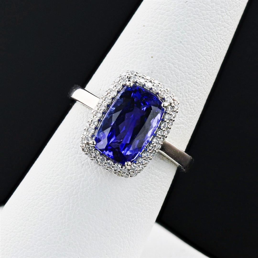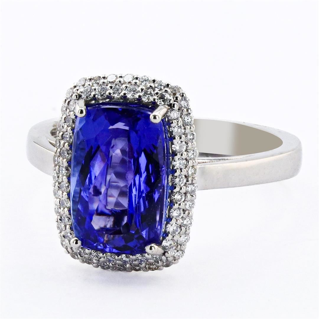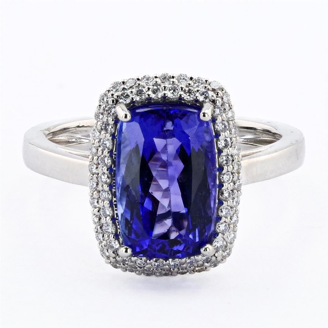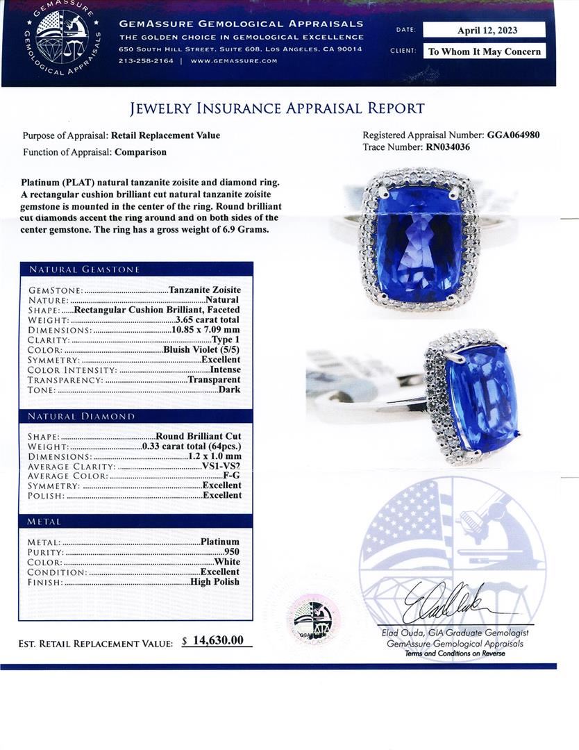 3.65ct Tanzanite and 0.33ctw Diamond Platinum Ring. Platinum (PLAT) natural tanzanite zoisite and diamond ring. A rectangular cushion brilliant cut natural tanzanite zoisite gemstone is mounted in the center of the ring. Round brilliant cut diamonds accent the ring around and on both sides of the center gemstone. The ring has a gross weight of 6.9 Grams. NATURAL GEMSTONE GEMSTONE: Tanzanite Zoisite NATURE: Natural SHAPE: Rectangular Cushion Brilliant, Faceted WEIGHT: 3.65 carat total DIMENSIONS: 10.85 x 7.09mm CLARITY: Type 1 COLOR: Bluish Violet (5/5) SYMMETRY: Excellent COLOR INTENSITY: Intense TRANSPARENCY: Transparent TONE: Dark NATURAL DIAMOND SHAPE: Round Brilliant Cut WEIGHT: 0.33 carat total (64pcs.) DIMENSIONS: 1.2 x 1.0mm AVERAGE CLARITY: VS1-VS2 AVERAGE COLOR: F-G SYMMETRY: Excellent POLISH: Excellent METAL METAL: Platinum PURITY: 950 COLOR: White CONDITION: Excellent FINISH: High Polish