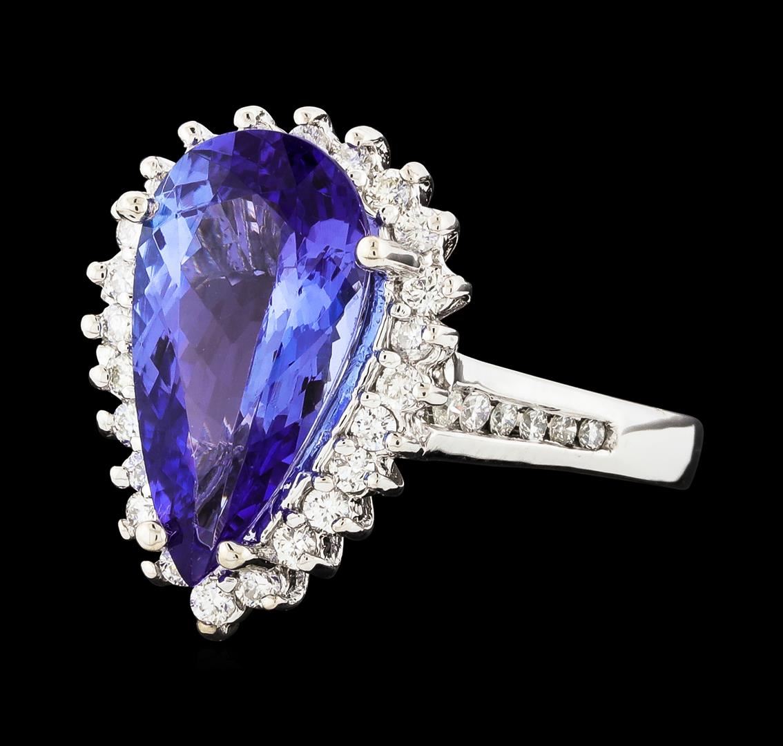 One electronically tested 14KT white gold lady's cast fashion ring with a basket halo with a bright polish finish. The featured lady's ring has a shank measuring 2.38 millimeters wide. Identified with markings of '14K'. Condition is new, good workmanship. Containing: One prong set pear modified brilliant cut natural tanzanite, measuring 15.06 x 8.01 x 4.86mm, (depth est.) approximate weight of 3.65ct., clarity is eye clean, medium, moderately strong, violetish blue color, (GIA vB 5/4), cut is good. Transmitting light with no distortion, transparent. Colored gemstones are presumed to have been subjected to commonly used enhancement processes. Graded in the setting. Twenty-Four prong set round brilliant cut diamonds, measuring 1.60 - 1.55 x 0.95mm (depth est.) approximate total weight of 24 Stones = 0.34ct. Graded in the setting. Clarity SI-1 to SI-2. Color: G - I Cut Good Twelve channel set round brilliant cut diamonds, measuring 1.50 - 1.25 x 0.86mm (depth est.) approximate total weight of 12 Stones = 0.13ct. Graded in the setting. Clarity SI-1 to SI-2. Color: H - I Cut Good. Total Weight of Colored Stones 3.65ct.. Total Weight of Diamonds 0.47ct.. Total Weight of Ring 5.50gm. GAS Appraised at $7,740.00.
