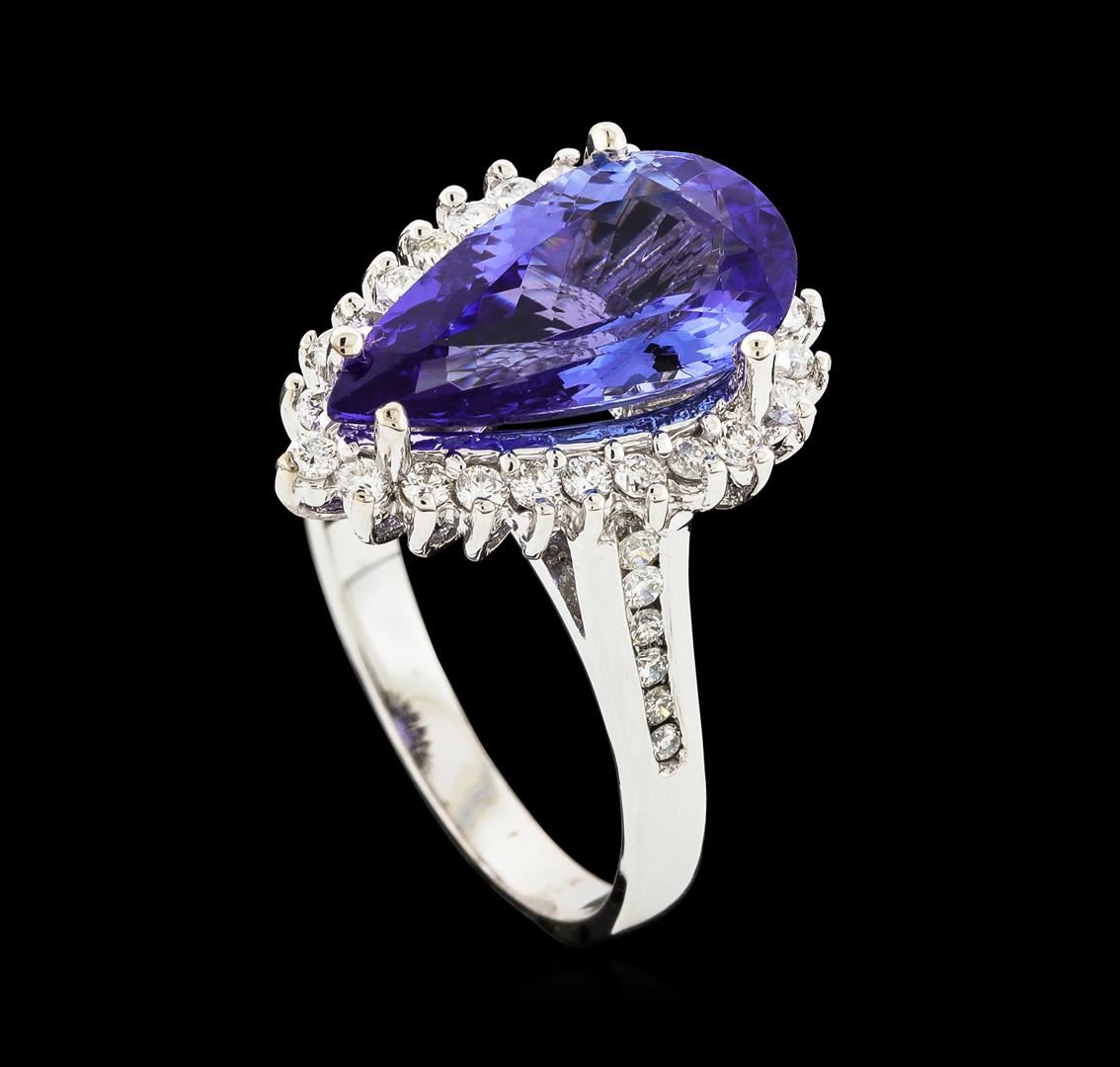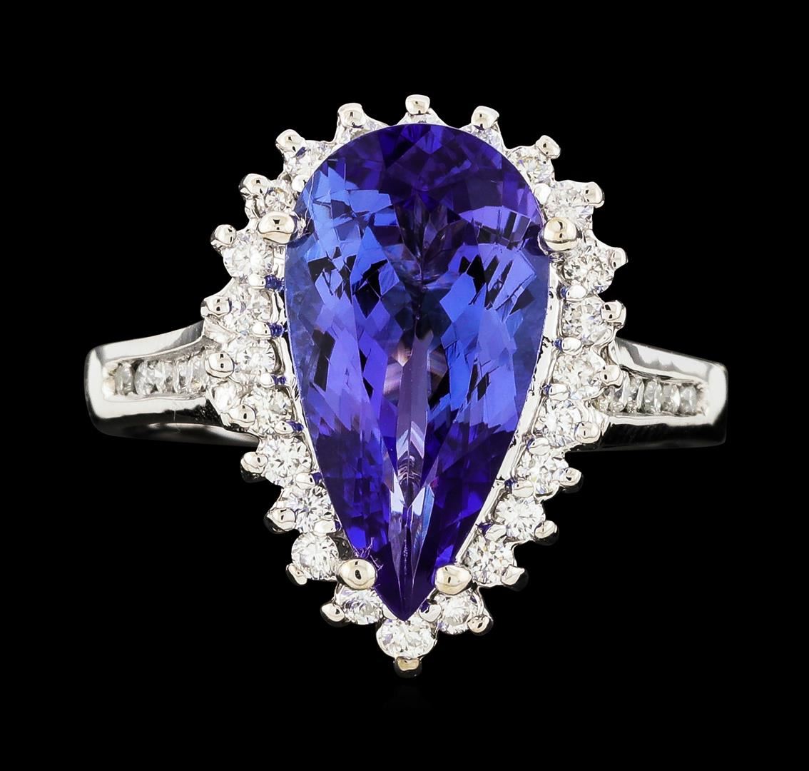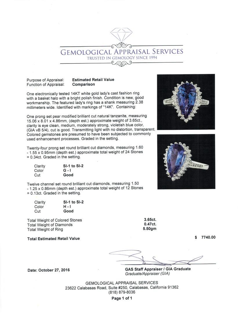 One electronically tested 14KT white gold lady's cast fashion ring with a basket halo with a bright polish finish. The featured lady's ring has a shank measuring 2.38 millimeters wide. Identified with markings of '14K'. Condition is new, good workmanship. Containing: One prong set pear modified brilliant cut natural tanzanite, measuring 15.06 x 8.01 x 4.86mm, (depth est.) approximate weight of 3.65ct., clarity is eye clean, medium, moderately strong, violetish blue color, (GIA vB 5/4), cut is good. Transmitting light with no distortion, transparent. Colored gemstones are presumed to have been subjected to commonly used enhancement processes. Graded in the setting. Twenty-Four prong set round brilliant cut diamonds, measuring 1.60 - 1.55 x 0.95mm (depth est.) approximate total weight of 24 Stones = 0.34ct. Graded in the setting. Clarity SI-1 to SI-2. Color: G - I Cut Good Twelve channel set round brilliant cut diamonds, measuring 1.50 - 1.25 x 0.86mm (depth est.) approximate total weight of 12 Stones = 0.13ct. Graded in the setting. Clarity SI-1 to SI-2. Color: H - I Cut Good. Total Weight of Colored Stones 3.65ct.. Total Weight of Diamonds 0.47ct.. Total Weight of Ring 5.50gm. GAS Appraised at $7,740.00.