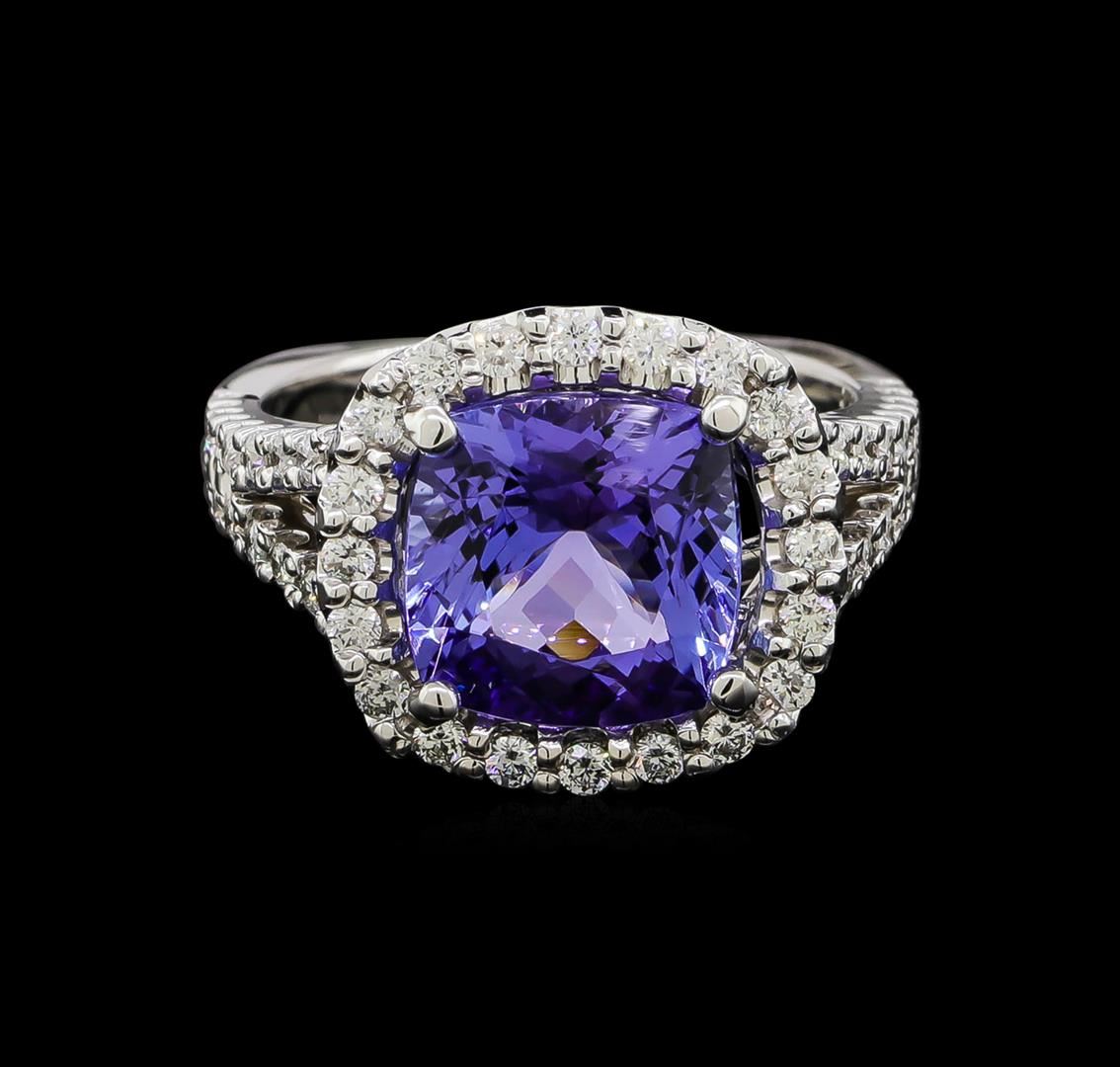 One electronically tested 14KT white gold lady's cast fashion ring with a split European shank with a halo with a bright polish finish. The featured lady's ring has a shank measuring 2.49 millimeters wide. Identified with markings of '14K'. Condition is new, good workmanship. Containing: One prong set square cushion modified brilliant cut natural tanzanite, measuring 9.31 x 9.20 x 5.71mm, (depth est.) approximate weight of 3.65ct., clarity is eye clean, medium, moderately strong, bluish violet color, (GIA bV 5/4), cut is good. Transmitting light with no distortion, transparent. Colored gemstones are presumed to have been subjected to commonly used enhancement processes. Graded in the setting. Twenty prong set round brilliant cut diamonds, measuring 1.60 - 1.50 x 0.96mm (depth est.) approximate total weight of 20 Stones = 0.29ct. Graded in the setting. Clarity SI-1 to SI-2. Color: H - I Cut Good Twenty prong set round brilliant cut diamonds, measuring 1.50 - 1.40 x 0.87mm (depth est.) approximate total weight of 20 Stones = 0.22ct. Graded in the setting. Clarity SI-1 to I-1. Color: H - I Cut Good Sixteen prong set round brilliant cut diamonds, measuring 1.30 - 1.20 x 0.78mm (depth est.) approximate total weight of 16 Stones = 0.12ct. Graded in the setting. Clarity SI-1 to I-1. Color: H - I Cut Good. Total Weight of Colored Stones 3.65ct.. Total Weight of Diamonds 0.63ct.. Total Weight of Ring 6.20gm GAS Appraised at $8,260.00.