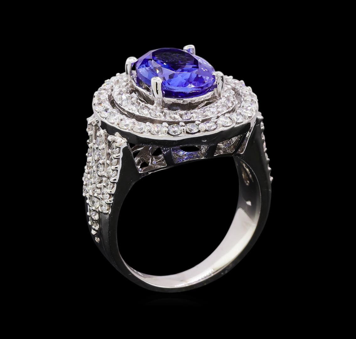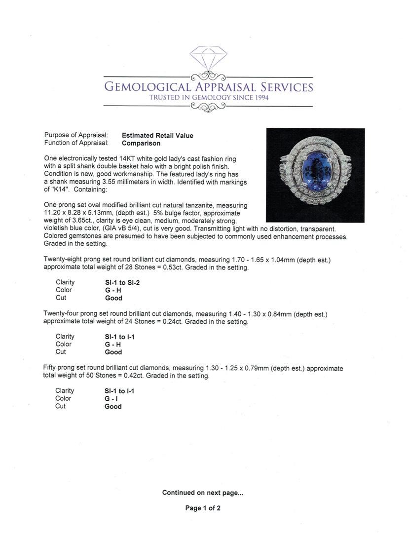 One electronically tested 14KT white gold lady's cast fashion ring with a split shank double basket halo with a bright polish finish. The featured lady's ring has a shank measuring 3.55 millimeters in width. Identified with markings of "K14". Condition is new, good workmanship. Containing: One prong set oval modified brilliant cut natural tanzanite, measuring 11.20 x 8.28 x 5.13mm, (depth est.) 5%. bulge factor, approximate weight of 3.65ct., clarity is eye clean, medium, moderately strong, violetish blue color, (GIA vB 5/4), cut is very good. Transmitting light with no distortion, transparent. Colored gemstones are presumed to have been subjected to commonly used enhancement processes. Graded in the setting. Twenty-Eight prong set round brilliant cut diamonds, measuring 1.70 - 1.65 x 1.04mm (depth est.) approximate total weight of 28 Stones = 0.53ct. Graded in the setting. Clarity: SI-1 to SI-2. Color: G - Good Twenty-Four prong set round brilliant cut diamonds, measuring 1.40 - 1.30 x 0.84mm (depth est.) approximate total weight of 24 Stones = 0.24ct. Graded in the setting. Clarity: SI-1 to I-1. Color: G - Good Fifty prong set round brilliant cut diamonds, measuring 1.30 - 1.25 x 0.79mm (depth est.) approximate total weight of 50 Stones = 0.42ct. Graded in the setting. Clarity: SI-1 to I-1. Color: G - I. Cut Good. Total Weight of Colored Stones 3.65ct. Total Weight of Diamonds 1.19ct. Total Weight of Ring 11.40gm. GAS Appraised at $10,880.00.