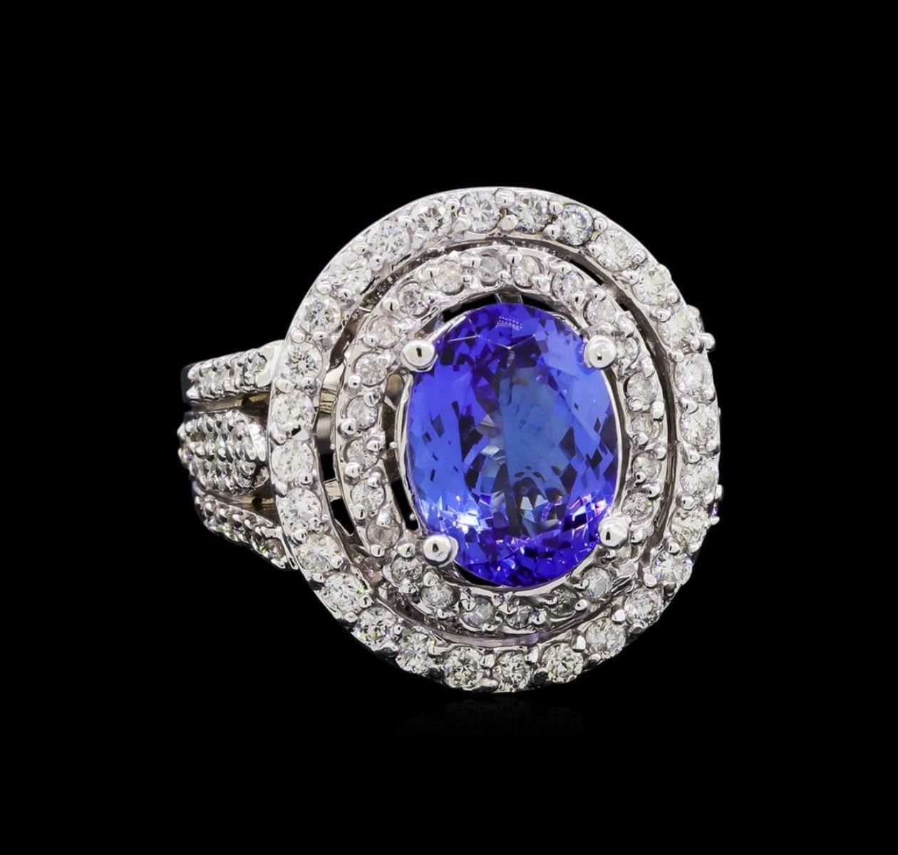 One electronically tested 14KT white gold lady's cast fashion ring with a split shank double basket halo with a bright polish finish. The featured lady's ring has a shank measuring 3.55 millimeters in width. Identified with markings of "K14". Condition is new, good workmanship. Containing: One prong set oval modified brilliant cut natural tanzanite, measuring 11.20 x 8.28 x 5.13mm, (depth est.) 5%. bulge factor, approximate weight of 3.65ct., clarity is eye clean, medium, moderately strong, violetish blue color, (GIA vB 5/4), cut is very good. Transmitting light with no distortion, transparent. Colored gemstones are presumed to have been subjected to commonly used enhancement processes. Graded in the setting. Twenty-Eight prong set round brilliant cut diamonds, measuring 1.70 - 1.65 x 1.04mm (depth est.) approximate total weight of 28 Stones = 0.53ct. Graded in the setting. Clarity: SI-1 to SI-2. Color: G - Good Twenty-Four prong set round brilliant cut diamonds, measuring 1.40 - 1.30 x 0.84mm (depth est.) approximate total weight of 24 Stones = 0.24ct. Graded in the setting. Clarity: SI-1 to I-1. Color: G - Good Fifty prong set round brilliant cut diamonds, measuring 1.30 - 1.25 x 0.79mm (depth est.) approximate total weight of 50 Stones = 0.42ct. Graded in the setting. Clarity: SI-1 to I-1. Color: G - I. Cut Good. Total Weight of Colored Stones 3.65ct. Total Weight of Diamonds 1.19ct. Total Weight of Ring 11.40gm. GAS Appraised.