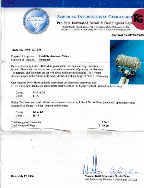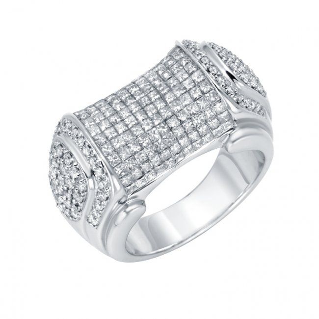 14K White gold custom cast diamond ring. The center concave section is set with 11 rows of princess cut diamonds. The terminal end shoulders are set with round brilliant cut diamonds. Identified with markings of "14K". Total weight of ring 22.43 grams Condition: Excellent