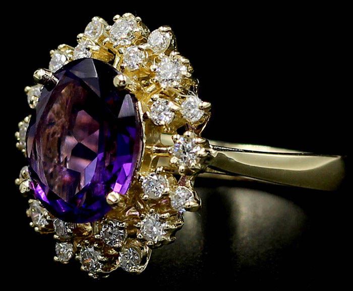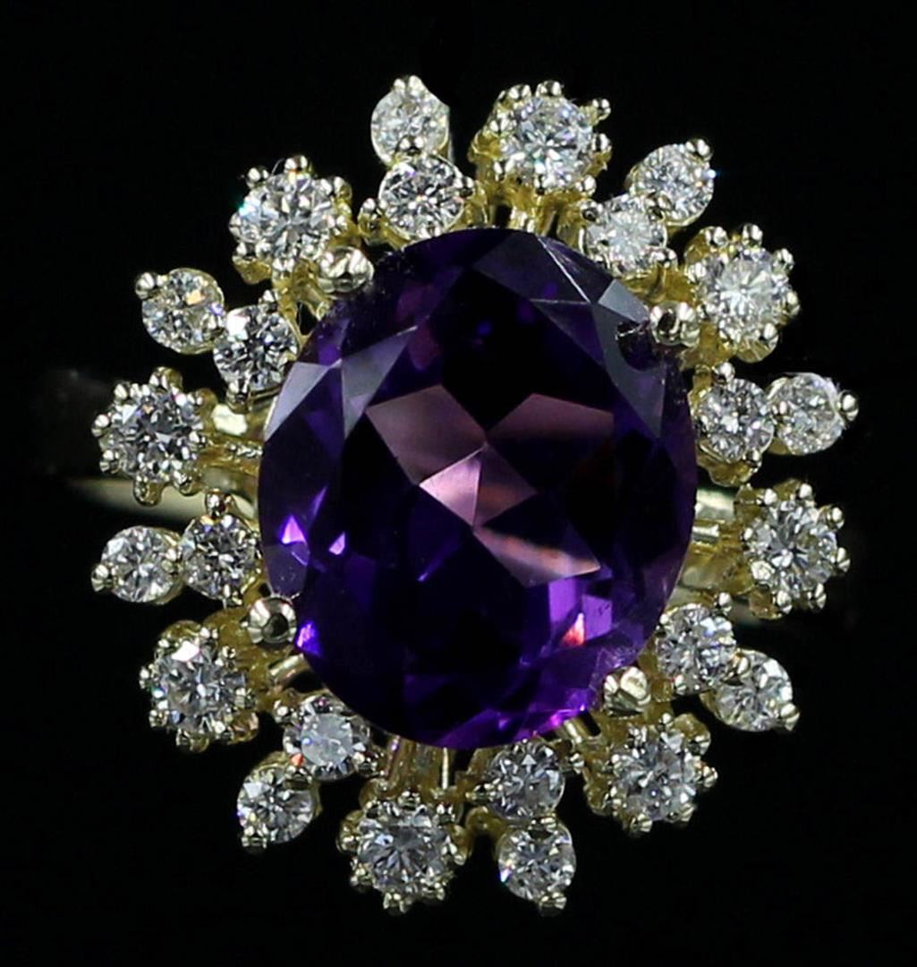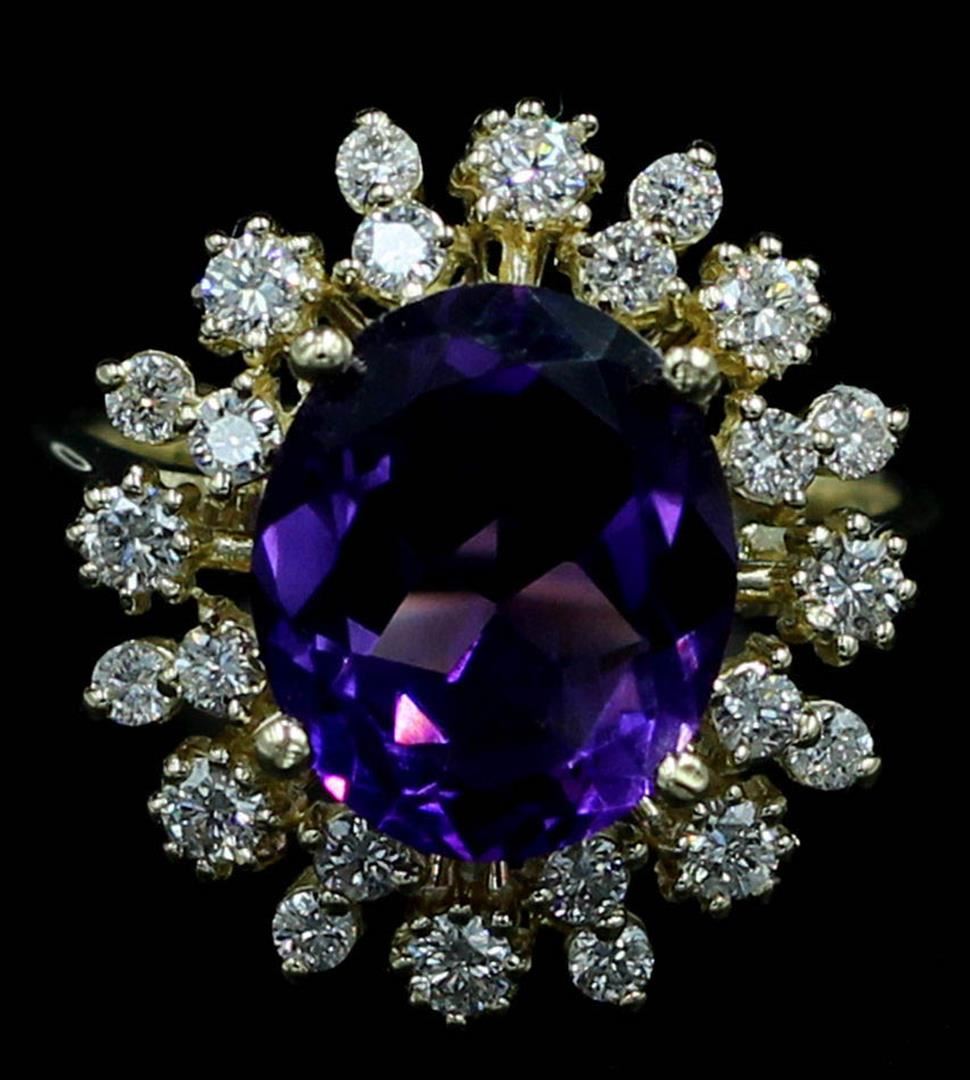One lady's ring featuring: 14KT yellow gold weighing 6.60 grams containing one amethyst weighing 3.66ct and 24 diamonds weighing 0.73ctw. The amethyst measures approximately 12.00mm x 10.00mm and is cut into an oval with fine clarity, purple color and excellent cut. The diamonds are round brilliant cut and are natural, unenhanced stones with SI-1 clarity, G-H color and excellent cut. The ring is a size 6.75 but is resizable.