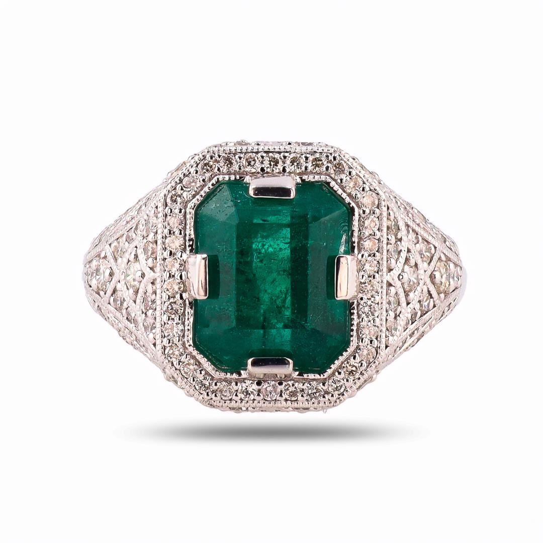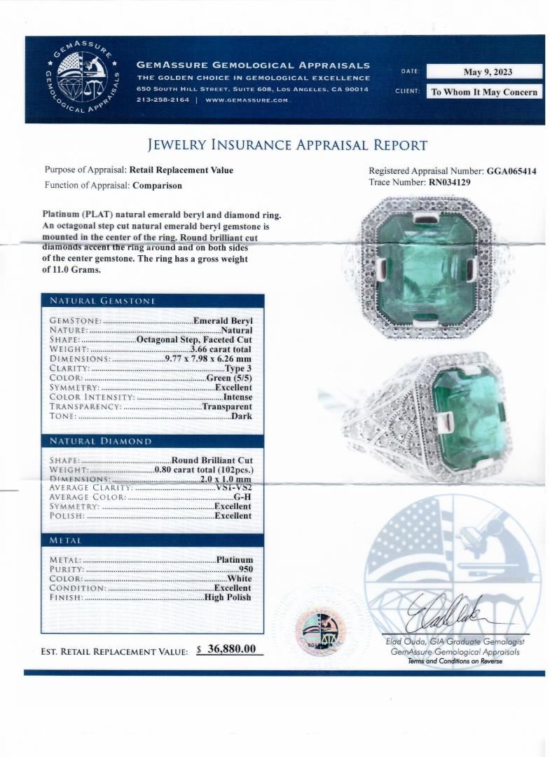 Platinum (PLAT) natural emerald beryl and diamond ring. An octagonal step cut natural emerald beryl gemstone is mounted in the center of the ring. Round brilliant cut diamonds accent the ring around and on both sides of the center gemstone. The ring has a gross weight of 11.0 Grams. #NATURAL GEMSTONE# GEMSTONE: Emerald Beryl; NATURE: Natural; SHAPE: Octagonal Step, Faceted Cut; WEIGHT: 3.66 carat total; DIMENSIONS: 9.77 x 1.98 x 6.26mm; CLARITY: Type 3; COLOR: Green (5/5); SYMMETRY: Excellent; COLOR INTENSITY: Intense; TRANSPARENCY: Transparent; TONE: Dark #NATURAL DIAMOND# SHAPE: Round Brilliant Cut; WEIGHT: 0.80 carat total (102pcs.); DIMENSIONS: 2.0 x 1.0mm; AVERAGE CLARITY: VS1-VS2; AVERAGE COLOR: G-H; SYMMETRY: Excellent; POLISH: Excellent #METAL# METAL: Platinum; PURITY: 950; COLOR: White; CONDITION: Excellent; FINISH: High Polish #Size: 6 3/4