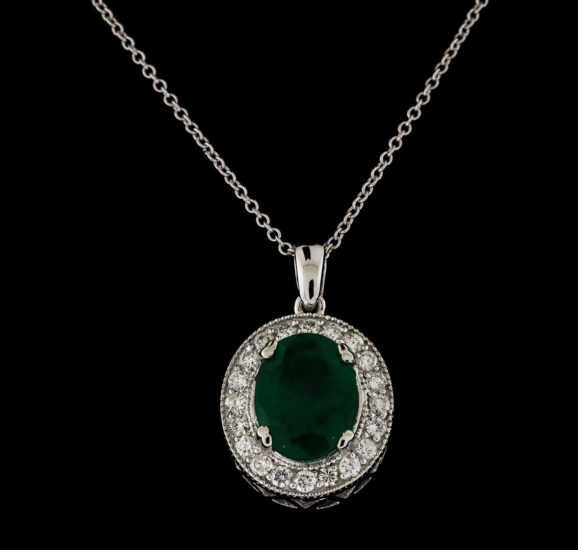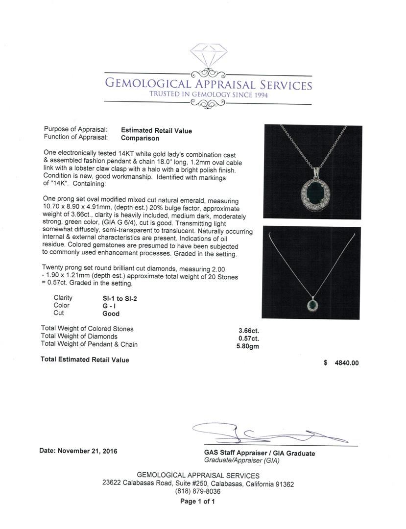 One electronically tested 14KT white gold lady's combination cast & assembled fashion pendant & chain 18.0' long, 1.2mm oval cable link with a lobster claw clasp with a halo with a bright polish finish. Identified with markings of '14K'. Condition is new, good workmanship. Containing: One prong set oval modified mixed cut natural emerald, measuring 10.70 x 8.90 x 4.91mm, (depth est.) 20%. bulge factor, approximate weight of 3.66ct., clarity is heavily included, medium dark, moderately strong, green color, (GIA G 6/4), cut is good. Transmitting light somewhat diffusely, semi-transparent to translucent. Naturally occurring internal & external characteristics are present. Indications of oil residue. Colored gemstones are presumed to have been subjected to commonly used enhancement processes. Graded in the setting. Twenty prong set round brilliant cut diamonds, measuring 2.00 - 1.90 x 1.21mm (depth est.) approximate total weight of 20 Stones = 0.57ct. Graded in the setting. Clarity SI-1 to SI-2. Color: G - I Cut Good. Total Weight of Colored Stones 3.66ct.. Total Weight of Diamonds 0.57ct.. Total Weight of Pendant & Chain 5.80gm. GAS Appraised at $4,840.00.