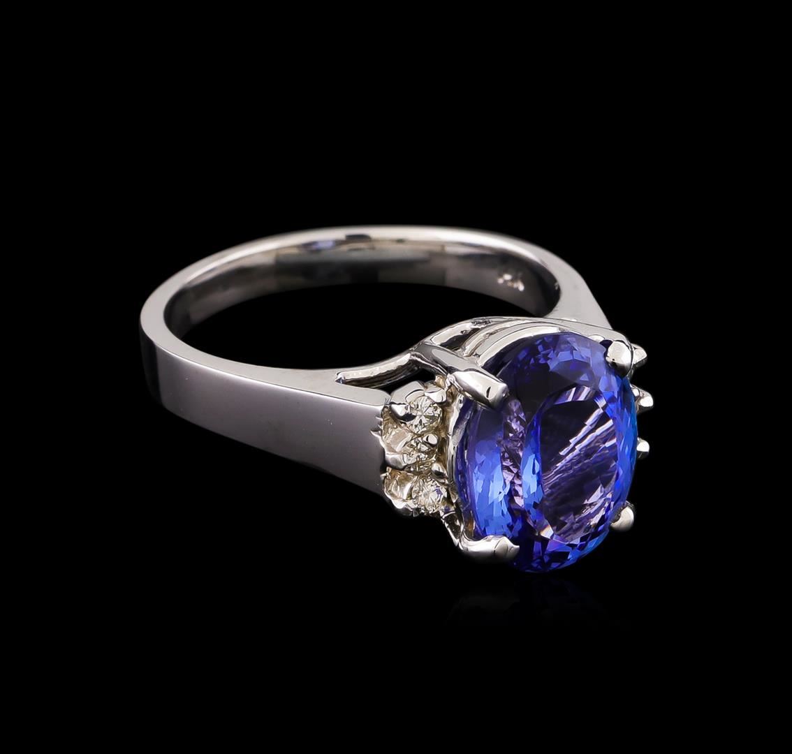One electronically tested 14KT white gold lady's cast fashion ring with a cathedral shank with a bright polish finish. The featured lady's ring has a shank measuring 2.62 millimeters wide. Identified with markings of "14K". Condition is new, good workmanship. Containing: One prong set oval modified brilliant cut natural tanzanite, measuring 10.97 x 8.31 x 5.29mm, 8%. bulge factor, approximate weight of 3.66ct., clarity is eye clean, medium, moderately strong, bluish violet color, (GIA bV 5/4), cut is very good. Transmitting light with no distortion, transparent. Colored gemstones are presumed to have been subjected to commonly used enhancement processes. Graded in the setting. Six prong set round brilliant cut diamonds, measuring 1.80 - 1.70 x 1.09mm (depth est.) approximate total weight of 6 Stones = 0.12ct. Graded in the setting. Clarity: SI-1 to SI-2. Color: H - I. Cut Good. Total Weight of Colored Stones 3.66ct. Total Weight of Diamonds 0.12ct. Total Weight of Ring 5.70gm. GAS Appraised at $6,825.00.
