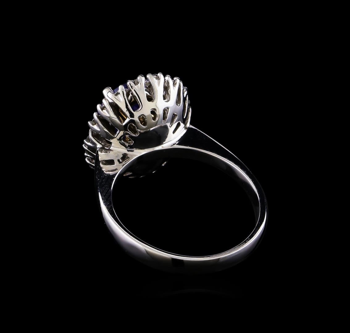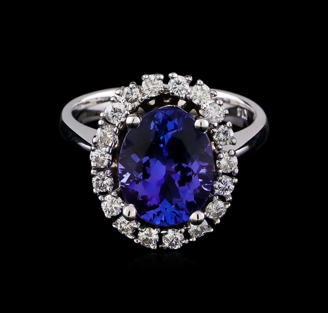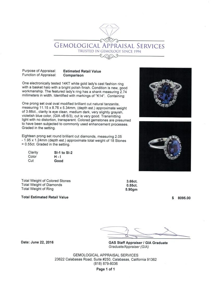 One electronically tested 14KT white gold lady's cast fashion ring with a basket halo with a bright polish finish. The featured lady's ring has a shank measuring 2.74 millimeters in width. Identified with markings of "K14". Condition is new, good workmanship. Containing: One prong set oval oval modified brilliant cut natural tanzanite, measuring 11.15 x 8.76 x 5.34mm, (depth est.) approximate weight of 3.66ct., clarity is eye clean, medium dark, very slightly grayish, violetish blue color, (GIA vB 6/3), cut is very good. Transmitting light with no distortion, transparent. Colored gemstones are presumed to have been subjected to commonly used enhancement processes. Graded in the setting. Eighteen prong set round brilliant cut diamonds, measuring 2.05 - 1.95 x 1.24mm (depth est.) approximate total weight of 18 Stones = 0.55ct. Graded in the setting. Clarity: SI-1 to SI-2. Color: H - I. Cut Good. Total Weight of Colored Stones 3.66ct. Total Weight of Diamonds 0.55ct. Total Weight of Ring 5.90gm. GAS Appraised at $8,095.00.