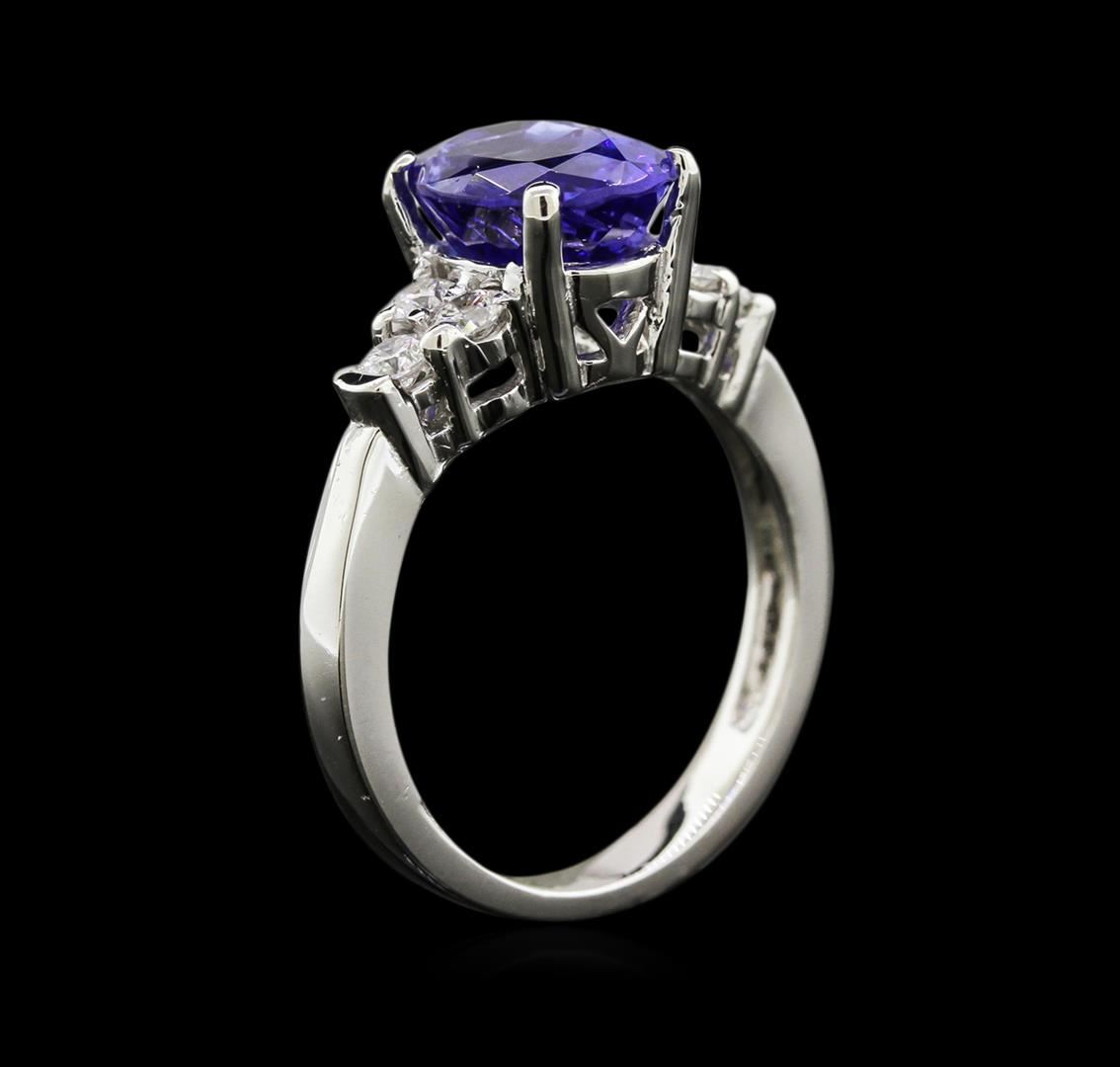 One electronically tested 14KT white gold lady's cast fashion ring with a bright polish finish. The featured lady's ring has a 2.72 millimeter wide shank. Identified with markings of "14K". Condition is new, good workmanship. Containing: One prong set oval modified brilliant cut natural tanzanite, measuring 9.95 x 7.99 x 6.55mm, approximate weight of 3.66ct., clarity is slightly included, type I, medium dark, very slightly grayish, bluish violet color, (GIA bV 6/3), cut is good. Transmitting light with no distortion, transparent. Colored gemstones are presumed to have been subjected to commonly used enhancement processes. Graded in the setting. Six prong set round brilliant cut diamonds, measuring 2.70 - 2.60 x 1.67mm (depth est.) approximate total weight of 6 Stones = 0.43ct. Graded in the setting. Clarity: SI-2 to I-1. Color: H - I. Cut Good. Total Weight of Colored Stones 3.66ct. Total Weight of Diamonds 0.43ct. Total Weight of Ring 5.00gm. GAS Appraised at $6,305.00.