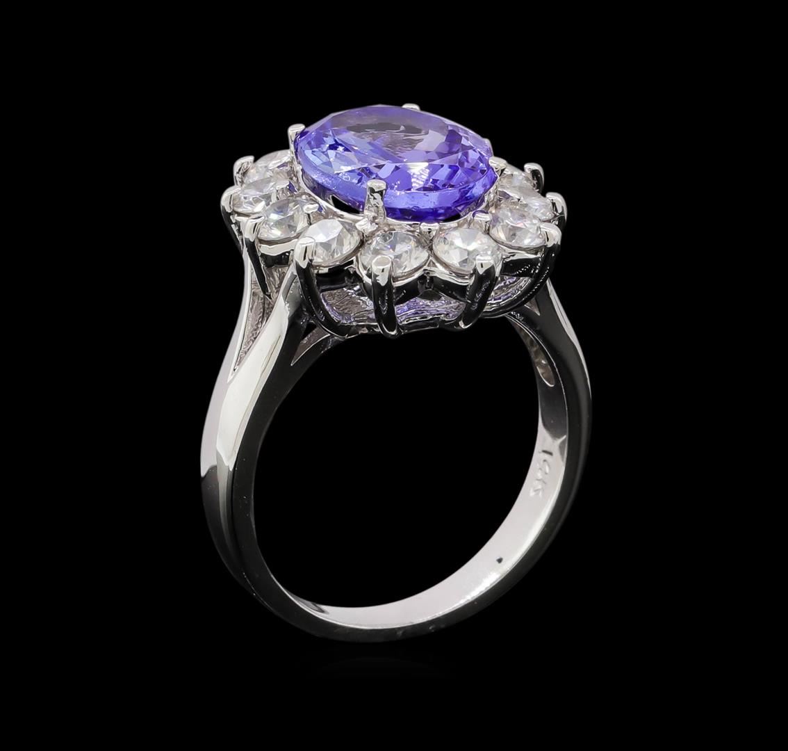 One electronically tested 14KT white gold lady's cast fashion ring with a split shank basket halo with a bright polish finish. The featured lady's ring has a shank measuring 2.95 millimeters in width. Identified with markings of '14K'. Condition is new, good workmanship. Containing: One prong set oval modified brilliant cut natural tanzanite, measuring 11.50 x 8.60 x 5.30mm, (depth est.) approximate weight of 3.66ct., clarity is eye clean, light, very slightly grayish, violetish blue color, (GIA vB 3/3), cut is good. Transmitting light with no distortion, transparent. Colored gemstones are presumed to have been subjected to commonly used enhancement processes. Graded in the setting. Twelve prong set round brilliant cut diamonds, measuring 3.25 - 3.15 x 1.98mm (depth est.) approximate total weight of 12 Stones = 1.53ct. Graded in the setting. Clarity VS-2 to SI-1. Color: I - J Cut Good. Total Weight of Colored Stones 3.66ct.. Total Weight of Diamonds 1.53ct.. Total Weight of Ring 7.70gm. GAS Appraised at $7,725.00.