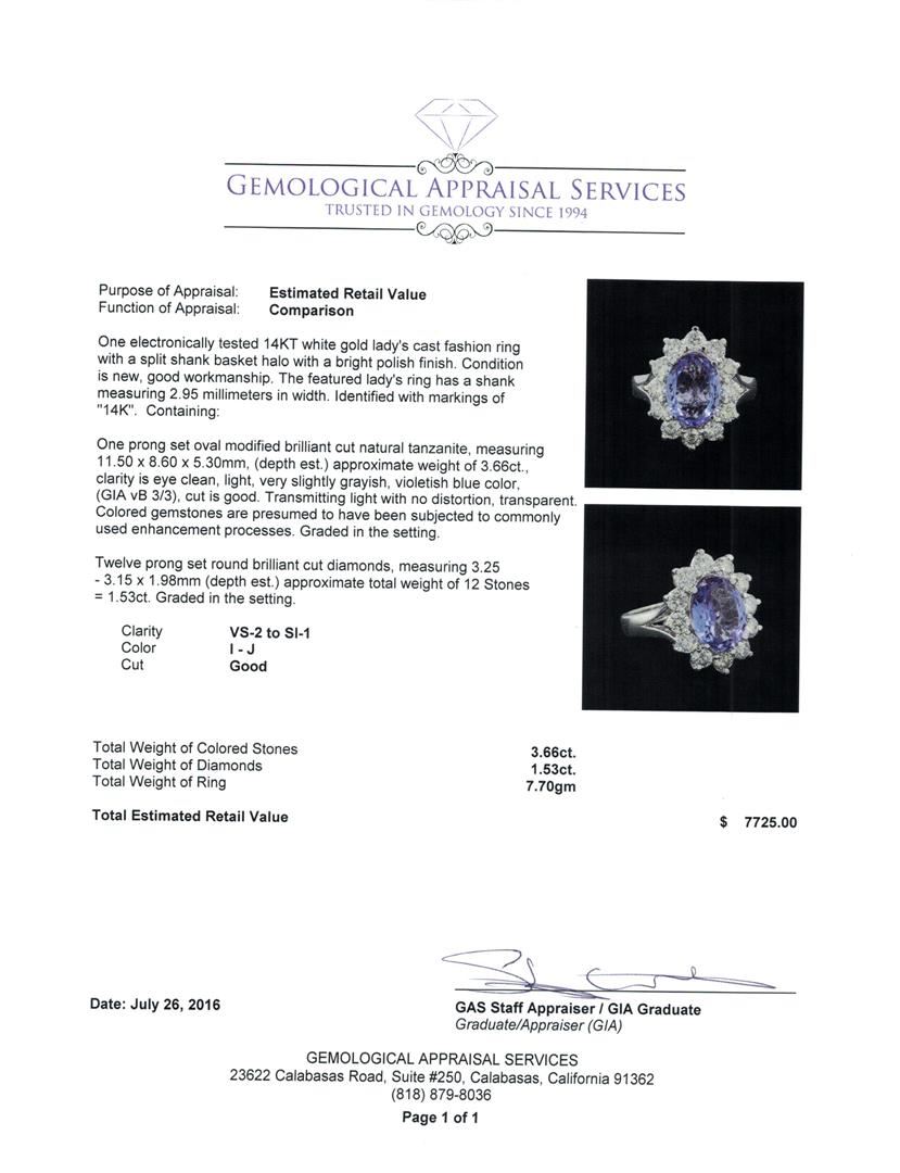 One electronically tested 14KT white gold lady's cast fashion ring with a split shank basket halo with a bright polish finish. The featured lady's ring has a shank measuring 2.95 millimeters in width. Identified with markings of '14K'. Condition is new, good workmanship. Containing: One prong set oval modified brilliant cut natural tanzanite, measuring 11.50 x 8.60 x 5.30mm, (depth est.) approximate weight of 3.66ct., clarity is eye clean, light, very slightly grayish, violetish blue color, (GIA vB 3/3), cut is good. Transmitting light with no distortion, transparent. Colored gemstones are presumed to have been subjected to commonly used enhancement processes. Graded in the setting. Twelve prong set round brilliant cut diamonds, measuring 3.25 - 3.15 x 1.98mm (depth est.) approximate total weight of 12 Stones = 1.53ct. Graded in the setting. Clarity VS-2 to SI-1. Color: I - J Cut Good. Total Weight of Colored Stones 3.66ct.. Total Weight of Diamonds 1.53ct.. Total Weight of Ring 7.70gm. GAS Appraised at $7,725.00.