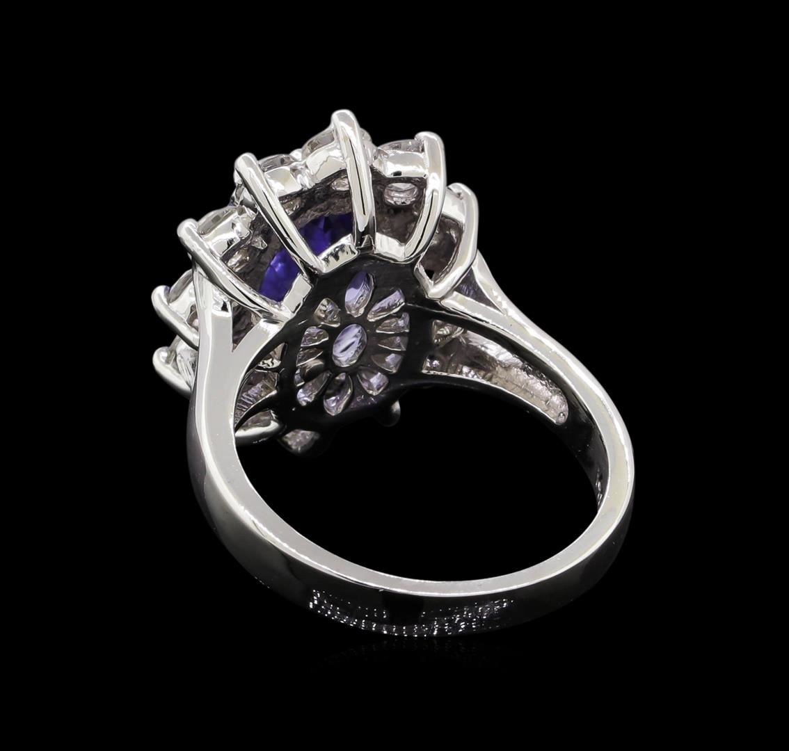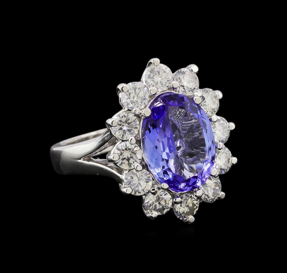 One electronically tested 14KT white gold lady's cast fashion ring with a split shank basket halo with a bright polish finish. The featured lady's ring has a shank measuring 2.95 millimeters in width. Identified with markings of '14K'. Condition is new, good workmanship. Containing: One prong set oval modified brilliant cut natural tanzanite, measuring 11.50 x 8.60 x 5.30mm, (depth est.) approximate weight of 3.66ct., clarity is eye clean, light, very slightly grayish, violetish blue color, (GIA vB 3/3), cut is good. Transmitting light with no distortion, transparent. Colored gemstones are presumed to have been subjected to commonly used enhancement processes. Graded in the setting. Twelve prong set round brilliant cut diamonds, measuring 3.25 - 3.15 x 1.98mm (depth est.) approximate total weight of 12 Stones = 1.53ct. Graded in the setting. Clarity VS-2 to SI-1. Color: I - J Cut Good. Total Weight of Colored Stones 3.66ct.. Total Weight of Diamonds 1.53ct.. Total Weight of Ring 7.70gm. GAS Appraised at $7,725.00.