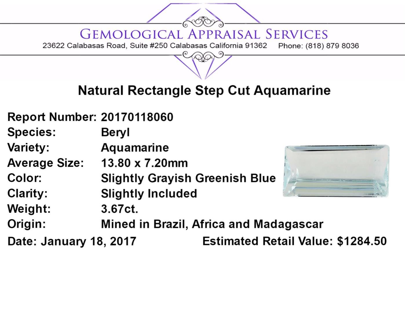 One natural rectangle step cut aquamarine with an exact weight of 3.67ct., clarity is slightly included, slightly grayish greenish blue. Gemological Appraisals Services estimates the retail value at $1284.5 GAS Appraised.
