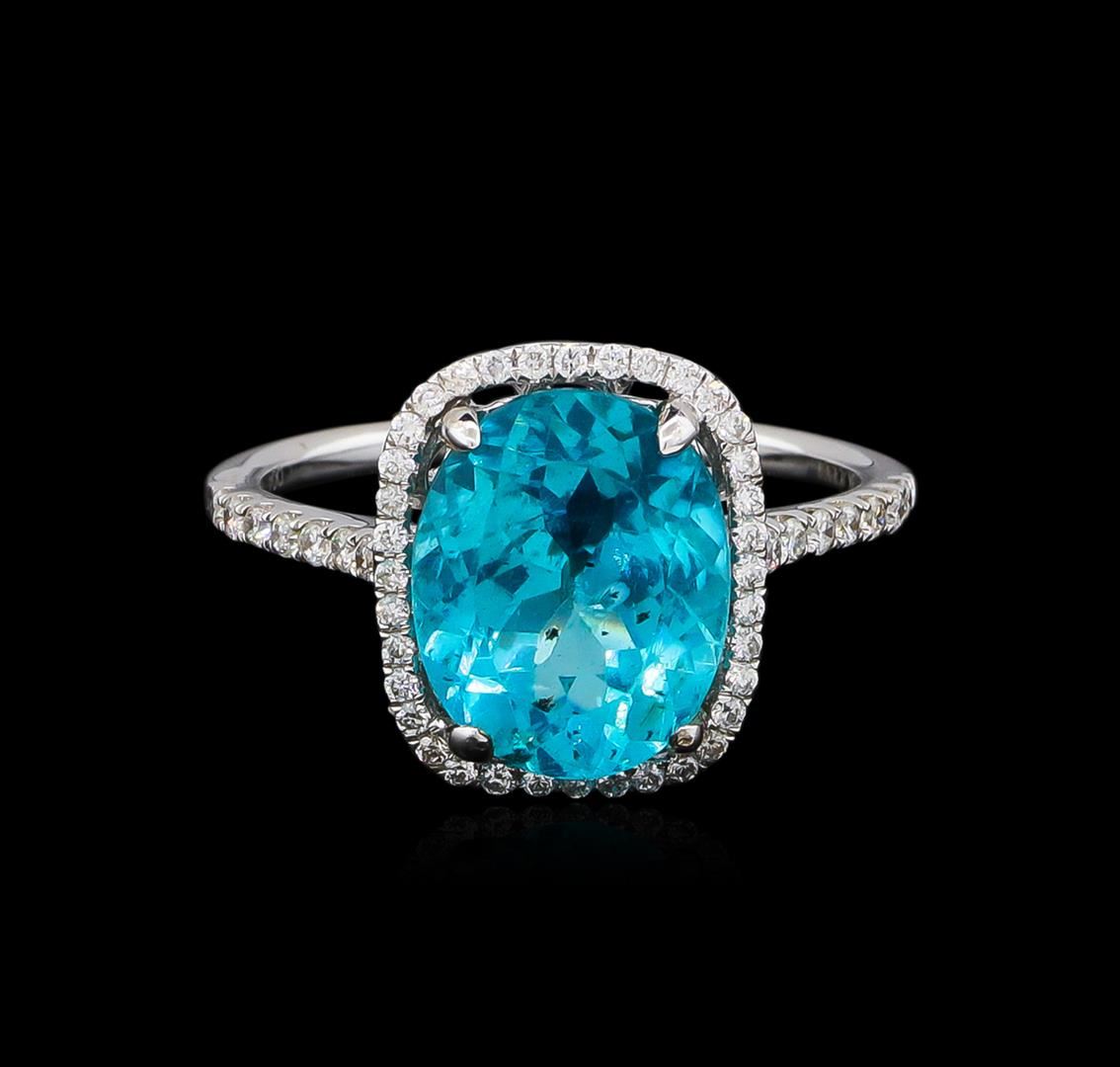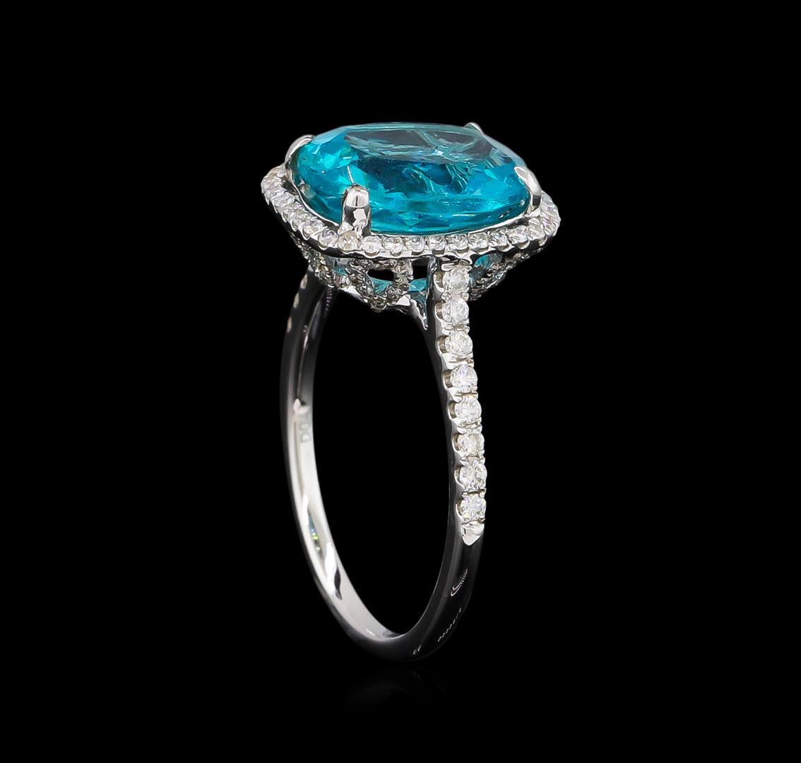One electronically tested 18KT white gold lady's cast fashion ring with a cathedral halo with a bright polish finish. The featured ladies ring has a shank measuring 1.45 millimeters in width. Trademark is HANA. Identified with markings of "18K". Condition is new, good workmanship. Containing: One prong set oval modified brilliant cut natural apatite, measuring 10.93 x 8.88 x 5.60mm, approximate weight of 3.67ct., clarity is slightly included, medium, moderately strong, very strongly bluish green color, (GIA vstbG 5/4), cut is good. Transmitting light with no distortion, transparent. Colored gemstones are presumed to have been subjected to commonly used enhancement processes. Graded in the setting. Sixteen prong set round brilliant cut diamonds, measuring 1.40 - 1.30 x 0.81mm (depth est.) approximate total weight of 16 Stones = 0.14ct. Graded in the setting. Clarity: VS-2 to SI-1. Color: H - I. Cut Very Good Ninety prong set round brilliant cut diamonds, measuring 1.00 - 0.90 x 0.57mm (depth est.) approximate total weight of 90 Stones = 0.27ct. Graded in the setting. Clarity: SI-1 to SI-2. Color: G - Very Good. Total Weight of Colored Stones 3.67ct. Total Weight of Diamonds 0.41ct. Total Weight of Ring 3.40gm. GAS Appraised at $5,015.00.
