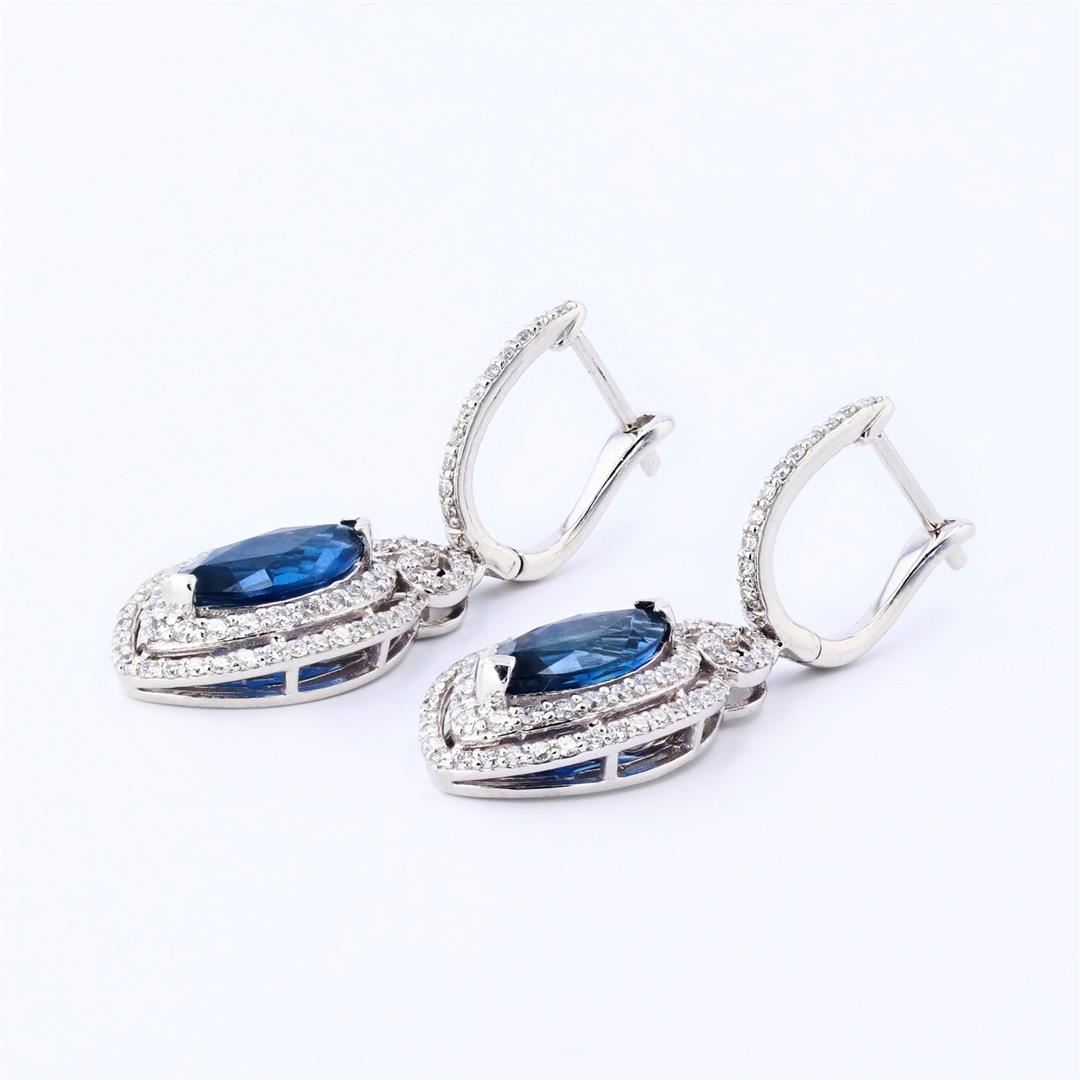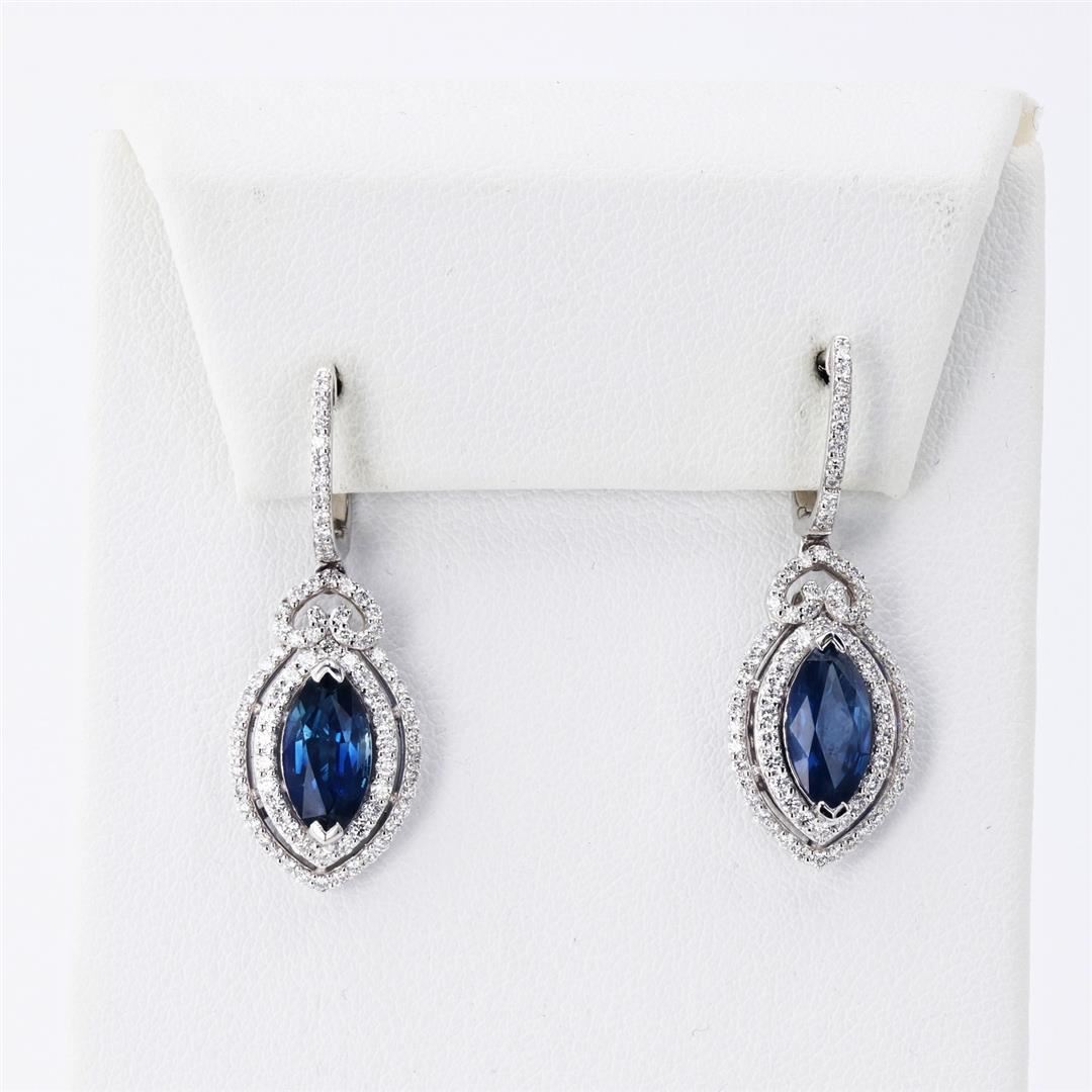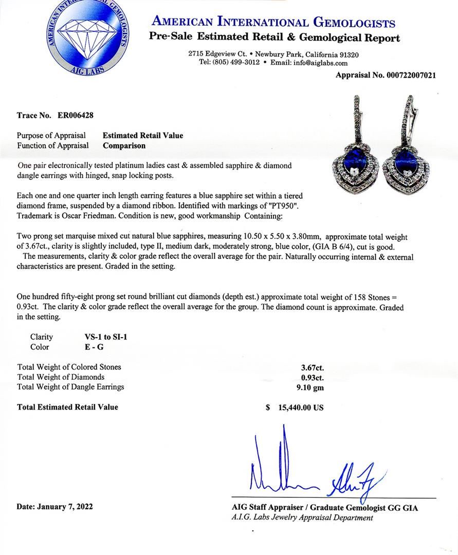 3.67ctw Blue Sapphire and 0.93ctw Diamond Platinum Earrings. Please see Photos and Description for all available information. This 3.67ctw Blue Sapphire and 0.93ctw Diamond Platinum Earrings is available in various metals. This pair is set in platinum. Set with 158 Diamonds, this pair is sure to make a statement. Every pair is handcrafted by our expert jewelers.