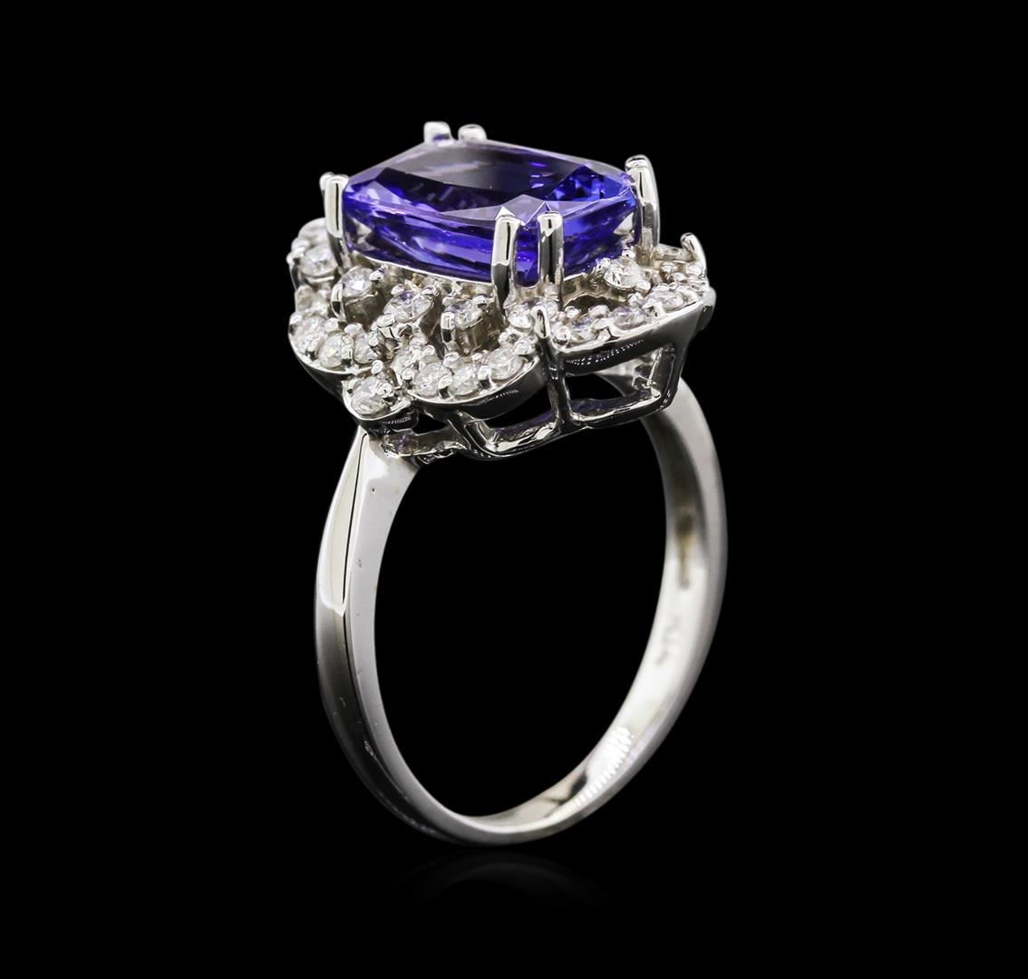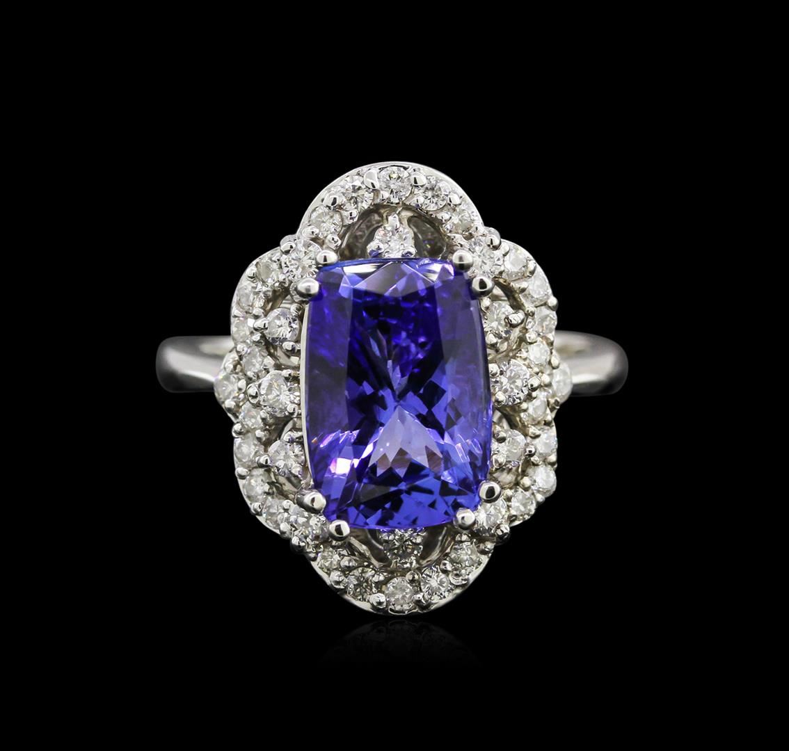 One electronically tested 14KT white gold lady's cast fashion ring with a bright polish finish. The featured lady's ring has a 2.14 millimeter wide shank. Identified with markings of "K14". Condition is new, good workmanship. Containing: One prong set rectangular cushion modified brilliant cut natural tanzanite, measuring 11.21 x 7.74 x 5.63mm, approximate weight of 3.67ct., clarity is eye clean, type I, medium dark, very slightly grayish, bluish violet color, (GIA bV 6/3), cut is good. Transmitting light with no distortion, transparent. Colored gemstones are presumed to have been subjected to commonly used enhancement processes. Graded in the setting. Forty prong set round brilliant cut diamonds, measuring 1.70 - 1.60 x 1.02mm (depth est.) approximate total weight of 40 Stones = 0.68ct. Graded in the setting. Clarity: SI-2 to I-1. Color: H - I. Cut Good. Total Weight of Colored Stones 3.67ct. Total Weight of Diamonds 0.68ct. Total Weight of Ring 5.60gm. GAS Appraised at $7,140.00.