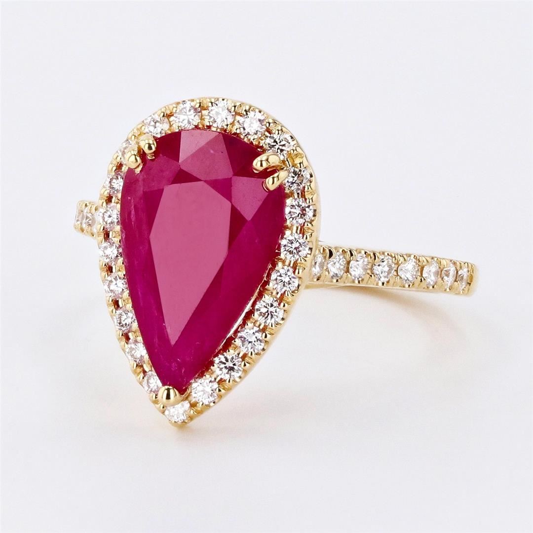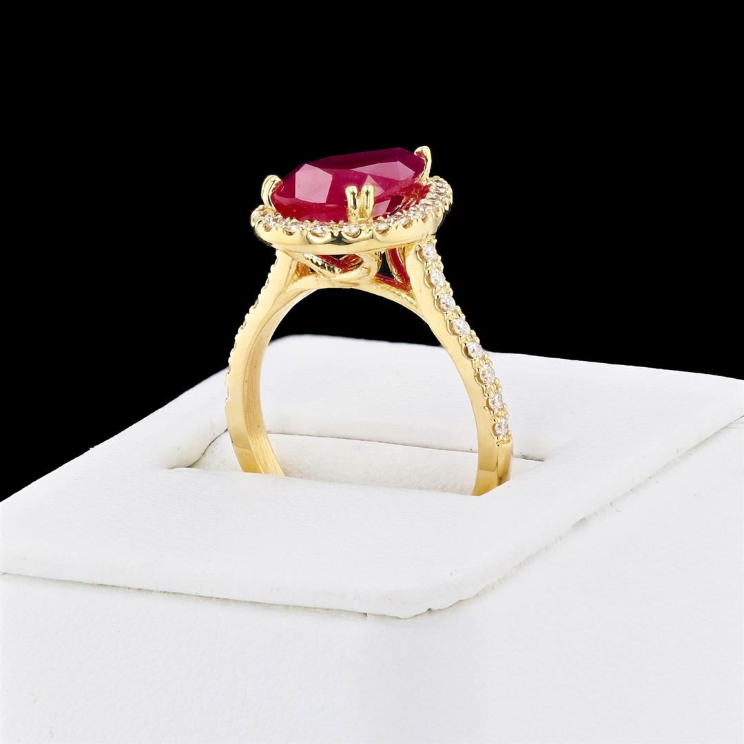 3.68ct Ruby and 0.37ctw Diamond 18K Yellow Gold Ring. Please see Photos and Description for all available information. An elegant and classic ring in 18K yellow gold, this ring features 3.68ct ruby gem and 0.37ctw diamond gem, 38 round brilliant cut diamonds, and is available in size 6 1/4. This ring is a timeless piece and will last as long as your love does.