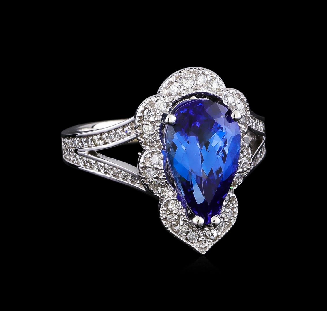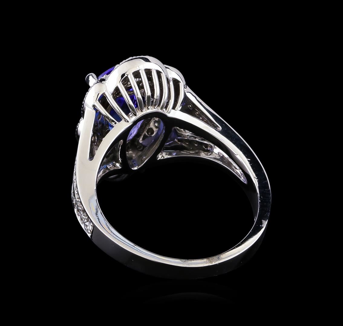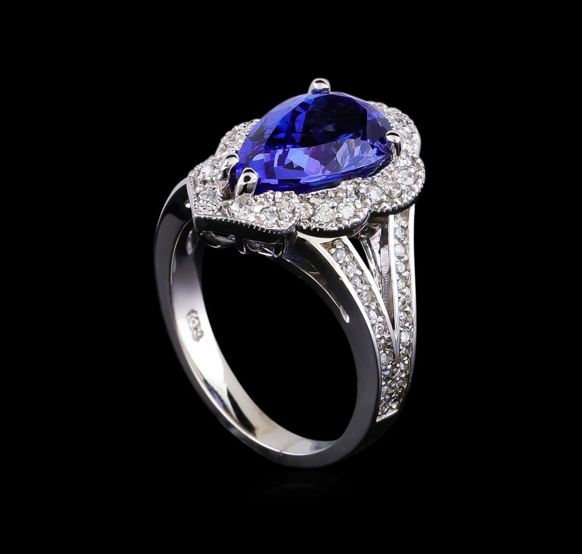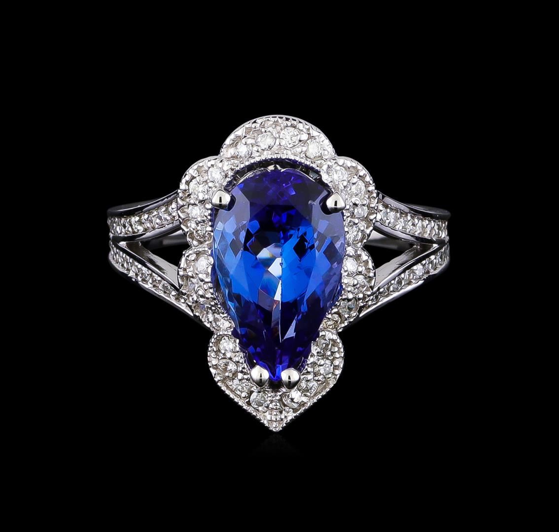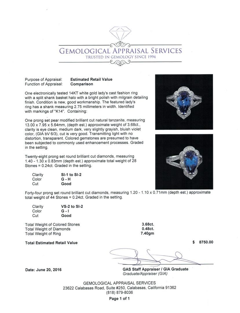 One electronically tested 14KT white gold lady's cast fashion ring with a split shank basket halo with a bright polish with milgrain detailing finish. The featured lady's ring has a shank measuring 2.75 millimeters in width. Identified with markings of "K14". Condition is new, good workmanship. Containing: One prong set pear modified brilliant cut natural tanzanite, measuring 13.00 x 7.95 x 5.64mm, (depth est.) approximate weight of 3.68ct., clarity is eye clean, medium dark, very slightly grayish, bluish violet color, (GIA bV 6/3), cut is very good. Transmitting light with no distortion, transparent. Colored gemstones are presumed to have been subjected to commonly used enhancement processes. Graded in the setting. Twenty-Eight prong set round brilliant cut diamonds, measuring 1.40 - 1.30 x 0.83mm (depth est.) approximate total weight of 28 Stones = 0.24ct. Graded in the setting. Clarity: SI-1 to SI-2. Color: G - Good Forty-Four prong set round brilliant cut diamonds, measuring 1.20 - 1.10 x 0.71mm (depth est.) approximate total weight of 44 Stones = 0.24ct. Graded in the setting. Clarity: VS-2 to SI-2. Color: G - I. Cut Good. Total Weight of Colored Stones 3.68ct. Total Weight of Diamonds 0.48ct. Total Weight of Ring 7.40gm GAS Appraised at $8,750.00.