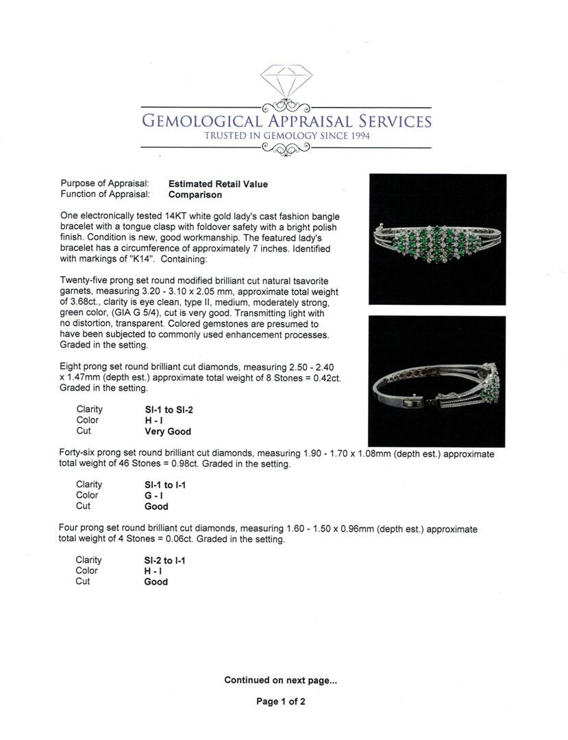 One electronically tested 14KT white gold lady's cast fashion bangle bracelet with a tongue clasp with foldover safety with a bright polish finish. The featured lady's bracelet has a circumference of approximately 7 inches. Identified with markings of "K14". Condition is new, good workmanship. Containing: Twenty-five prong set round modified brilliant cut natural tsavorite garnets, measuring 3.20 - 3.10 x 2.05 mm, approximate total weight of 3.68ct., clarity is eye clean, type II, medium, moderately strong, green color, (GIA G 5/4), cut is very good. Transmitting light with no distortion, transparent. Colored gemstones are presumed to have been subjected to commonly used enhancement processes. Graded in the setting. Eight prong set round brilliant cut diamonds, measuring 2.50 - 2.40 x 1.47mm (depth est.) approximate total weight of 8 Stones = 0.42ct. Graded in the setting. Clarity: SI-1 to SI-2. Color: H - I. Cut Very Good Forty-Six prong set round brilliant cut diamonds, measuring 1.90 - 1.70 x 1.08mm (depth est.) approximate total weight of 46 Stones = 0.98ct. Graded in the setting. Clarity: SI-1 to I-1. Color: G - I. Cut Good Four prong set round brilliant cut diamonds, measuring 1.60 - 1.50 x 0.96mm (depth est.) approximate total weight of 4 Stones = 0.06ct. Graded in the setting. Clarity: SI-2 to I-1. Color: H - I. Cut Good. Total Weight of Colored Stones 3.68ct. Total Weight of Diamonds 1.46ct. Total Weight of Bangle Bracelet 24.40gm. GAS Appraised at $11,095.00.