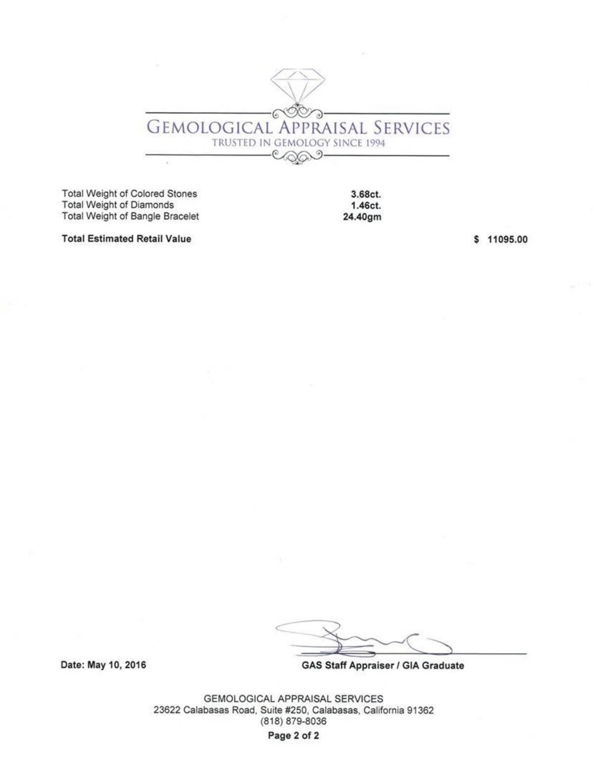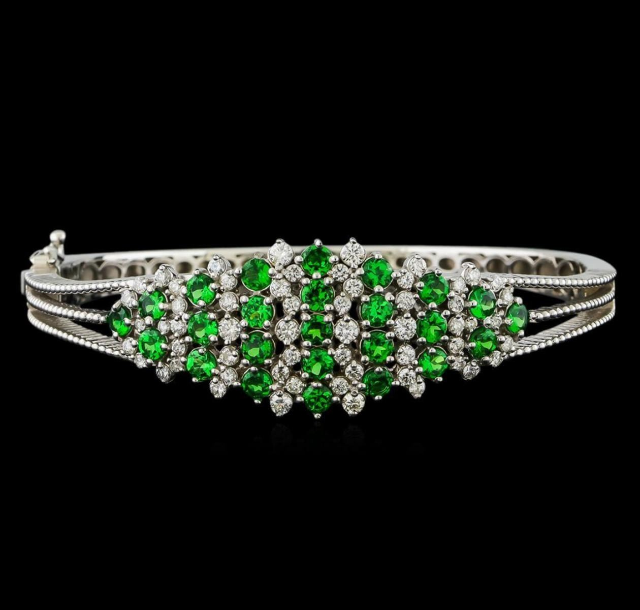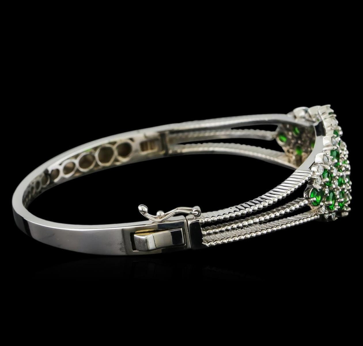 One electronically tested 14KT white gold lady's cast fashion bangle bracelet with a tongue clasp with foldover safety with a bright polish finish. The featured lady's bracelet has a circumference of approximately 7 inches. Identified with markings of "K14". Condition is new, good workmanship. Containing: Twenty-five prong set round modified brilliant cut natural tsavorite garnets, measuring 3.20 - 3.10 x 2.05 mm, approximate total weight of 3.68ct., clarity is eye clean, type II, medium, moderately strong, green color, (GIA G 5/4), cut is very good. Transmitting light with no distortion, transparent. Colored gemstones are presumed to have been subjected to commonly used enhancement processes. Graded in the setting. Eight prong set round brilliant cut diamonds, measuring 2.50 - 2.40 x 1.47mm (depth est.) approximate total weight of 8 Stones = 0.42ct. Graded in the setting. Clarity: SI-1 to SI-2. Color: H - I. Cut Very Good Forty-Six prong set round brilliant cut diamonds, measuring 1.90 - 1.70 x 1.08mm (depth est.) approximate total weight of 46 Stones = 0.98ct. Graded in the setting. Clarity: SI-1 to I-1. Color: G - I. Cut Good Four prong set round brilliant cut diamonds, measuring 1.60 - 1.50 x 0.96mm (depth est.) approximate total weight of 4 Stones = 0.06ct. Graded in the setting. Clarity: SI-2 to I-1. Color: H - I. Cut Good. Total Weight of Colored Stones 3.68ct. Total Weight of Diamonds 1.46ct. Total Weight of Bangle Bracelet 24.40gm. GAS Appraised.