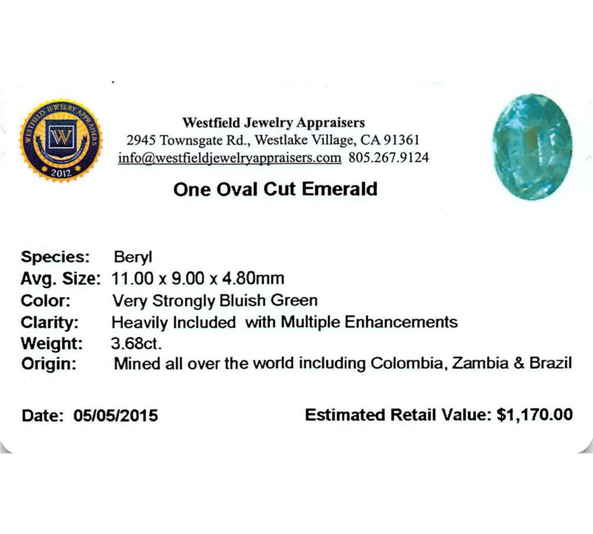 One oval mixed cut natural emerald, measuring 10.70 x 8.10 x 6.60mm, exact weight 3.68ct., clarity is heavily included, type III, dark, very slightly grayish, very strongly bluish green color, (GIA vstbG 7/3), cut is good. Indications of multiple laboratory enhancements, including high temperature heat treatment. Westfield Appraised at $1,170.00.