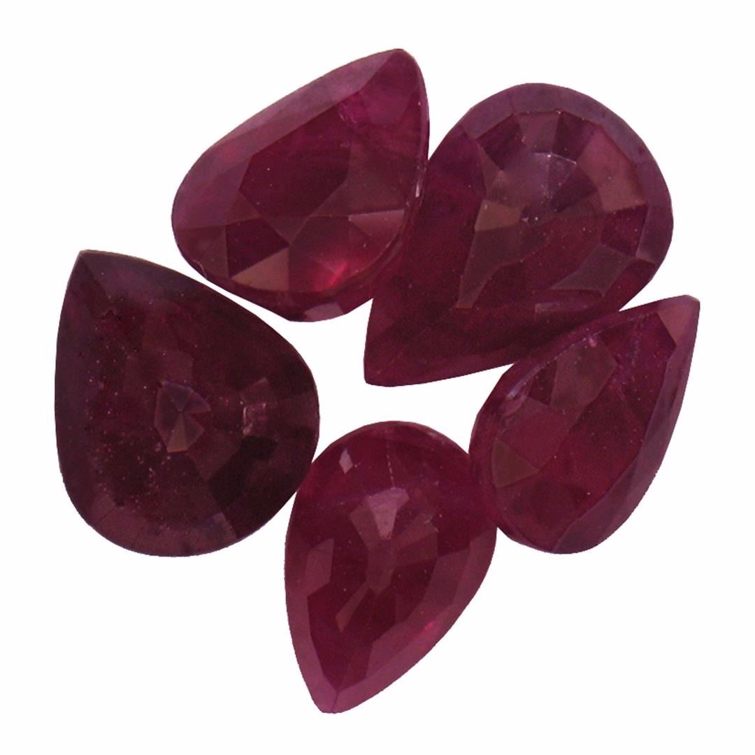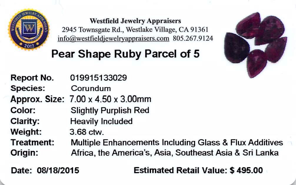 Five pear mixed cut natural rubies, measuring 7.00 x 4.50 x 3.00mm, exact total weight 3.68ct., clarity is heavily included, type II, medium dark, very slightly brownish, slightly purplish red color, (GIA slpR 6/3), cut is good. Color & clarity grade are an average for the group, Graded loose, Indications of multiple laboratory enhancements, including high temperature heat treatment, Measurements are an average for the group. Westfield Appraised at $495.00.